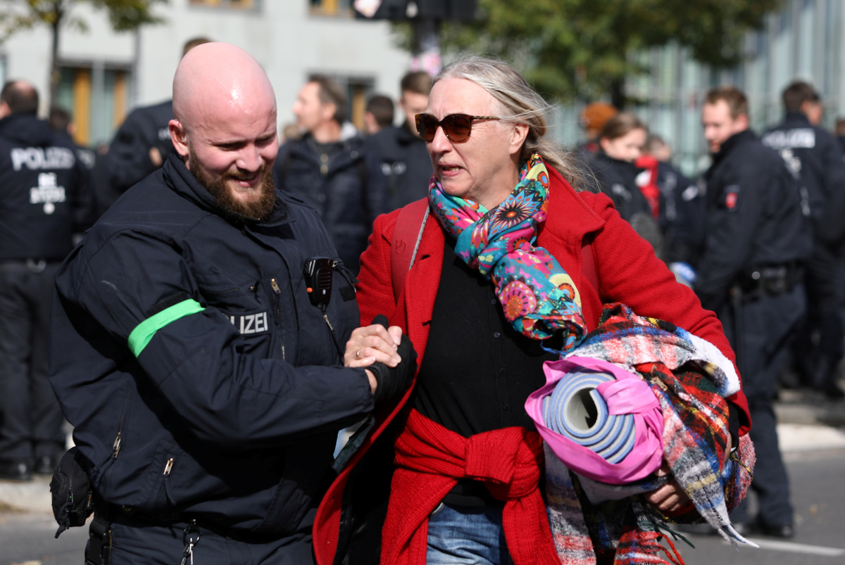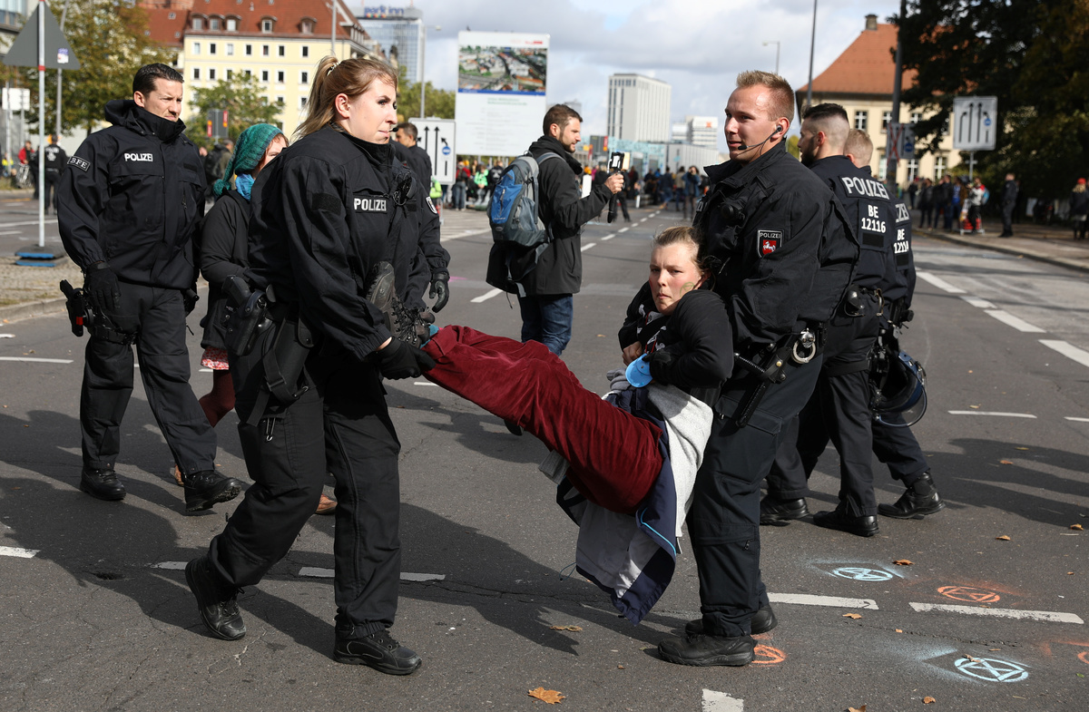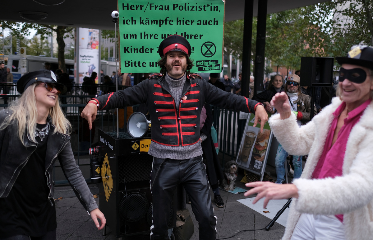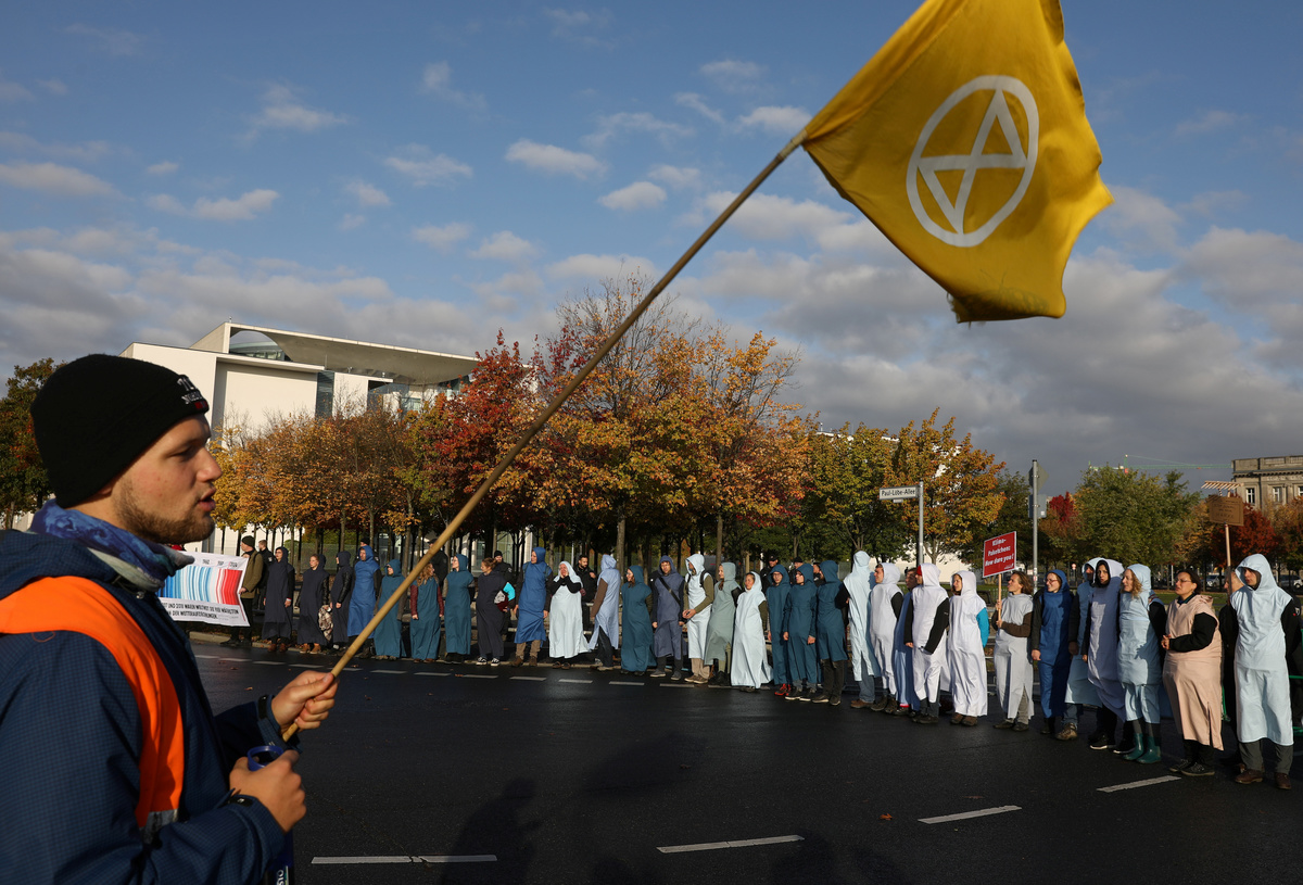 As Merkel and her ministers met at the chancellery in Berlin, hundreds of Extinction Rebellion activists blocked a nearby bridge on the third day of global protests to press governments to do more to combat global warming.