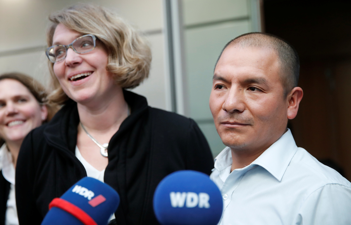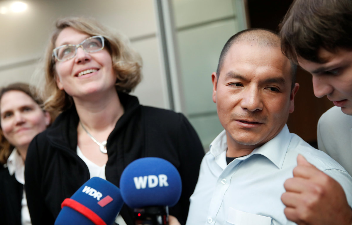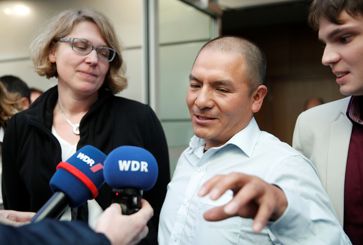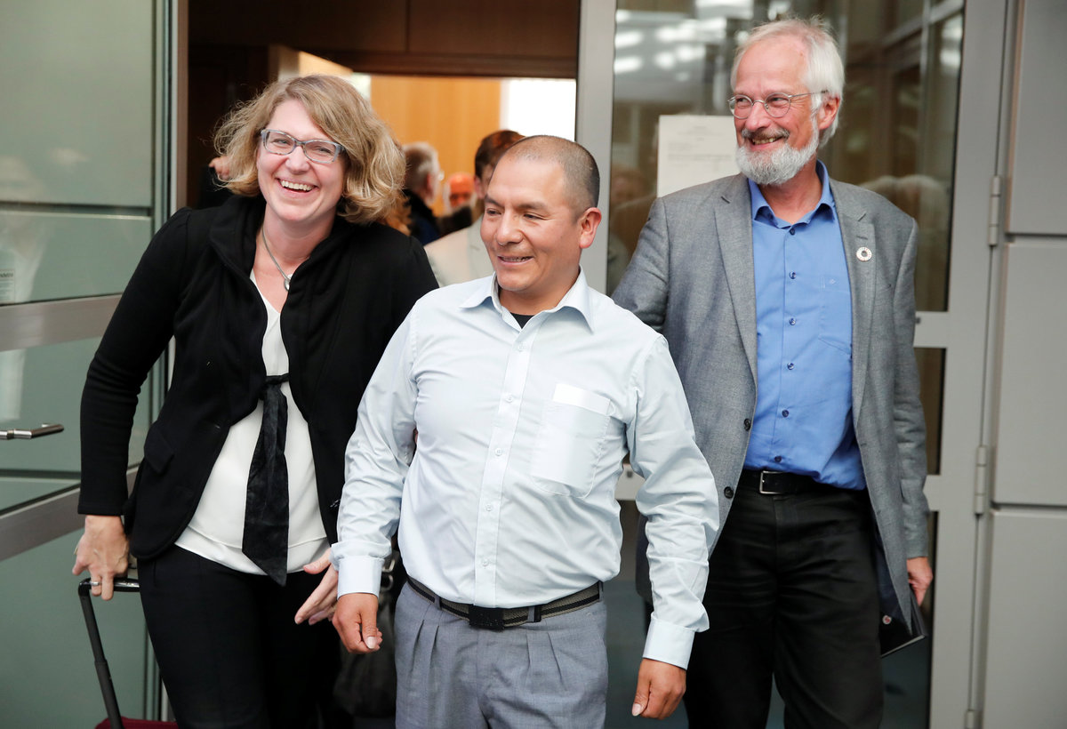 Judges Astrid Uelwer, Rolf Meyer and Tanja Kothes of the high German regional court of Hamm are pictured before the trial of Peruvian farmer and mountain guide Saul Luciano Lliuya against RWE, one of Europe's biggest electricity companies, in Hamm, Germany, November 13, 2017. REUTERS/Wolfgang RattayPeruvian farmer and mountain guide Saul Luciano Lliuya reacts with his lawyer Roda Verheyen and Germanwatch president Klaus Milke, as he leaves a high regional German court after the court ruled against RWE, one of Europe's biggest electricity companies, in Hamm, Germany, November 13, 2017. REUTERS/Wolfgang RattayPeruvian farmer and mountain guide Saul Luciano Lliuya reacts with his lawyer Roda Verheyen and Germanwatch president Klaus Milke, as he leaves a high regional German court after the court ruled against RWE, one of Europe's biggest electricity companies, in Hamm, Germany, November 13, 2017. REUTERS/Wolfgang RattayPeruvian farmer and mountain guide Saul Luciano Lliuya, his lawyer Roda Verheyen and his translator talk to the media after a high regional German court ruled against RWE, one of Europe's biggest electricity companies, in Hamm, Germany, November 13, 2017. REUTERS/Wolfgang RattayPeruvian farmer and mountain guide Saul Luciano Lliuya and his lawyer Roda Verheyen react after a high regional German court ruled against RWE, one of Europe's biggest electricity companies, in Hamm, Germany, November 13, 2017. REUTERS/Wolfgang RattayPeruvian farmer and mountain guide Saul Luciano Lliuya and his lawyer Roda Verheyen react after a high regional German court ruled against RWE, one of Europe's biggest electricity companies, in Hamm, Germany, November 13, 2017. REUTERS/Wolfgang RattayPeruvian farmer and mountain guide Saul Luciano Lliuya and his lawyer Roda Verheyen react after a high regional German court ruled against RWE, one of Europe's biggest electricity companies, in Hamm, Germany, November 13, 2017. REUTERS/Wolfgang RattayPeruvian farmer and mountain guide Saul Luciano Lliuya and his lawyer Roda Verheyen talk after a high regional German court ruled against RWE, one of Europe's biggest electricity companies, in Hamm, Germany, November 13, 2017. REUTERS/Wolfgang Rattay