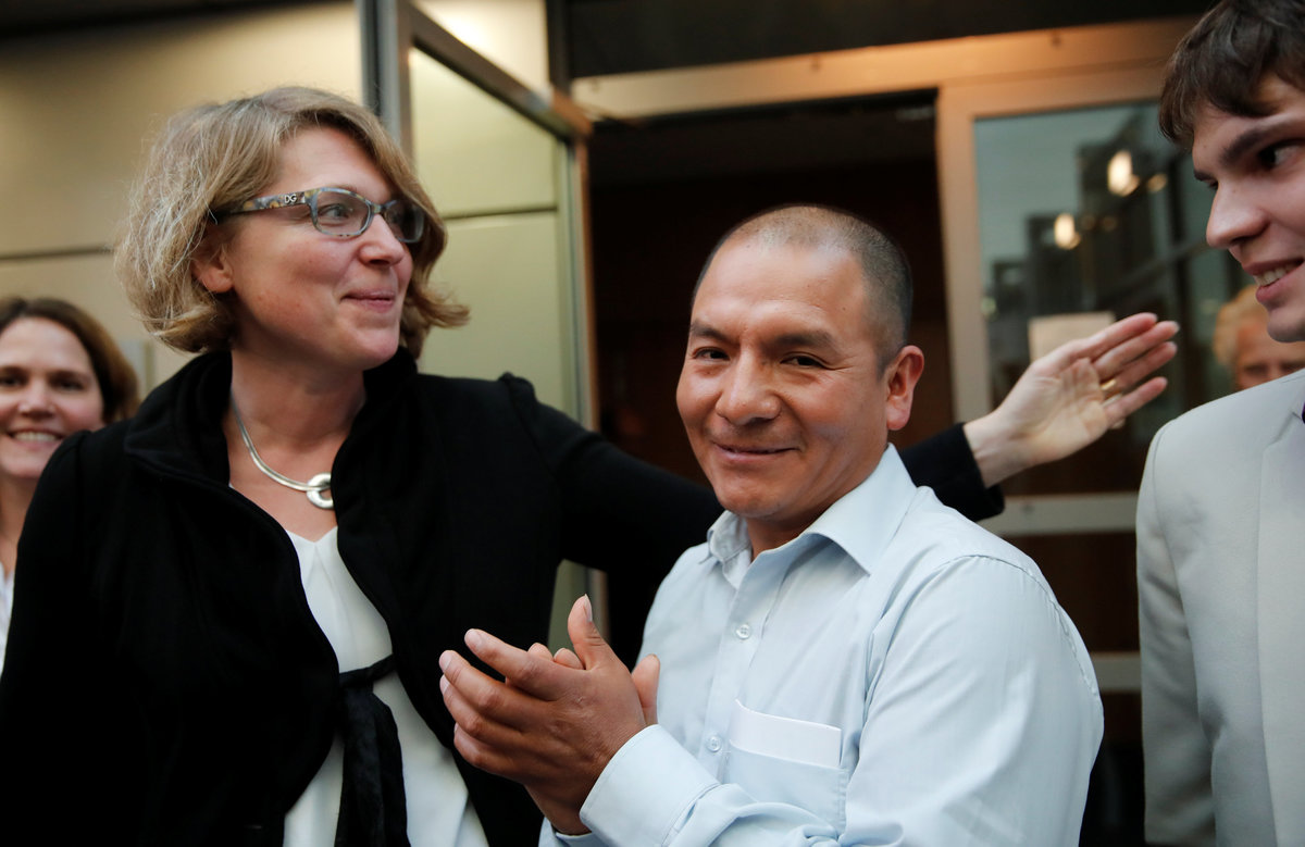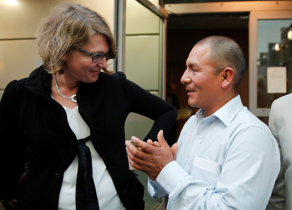 Peruvian farmer and mountain guide Saul Luciano Lliuya, his lawyer Roda Verheyen and his translator react after a high regional German court ruled against RWE, one of Europe's biggest electricity companies, in Hamm, Germany, November 13, 2017. REUTERS/Wolfgang Rattay