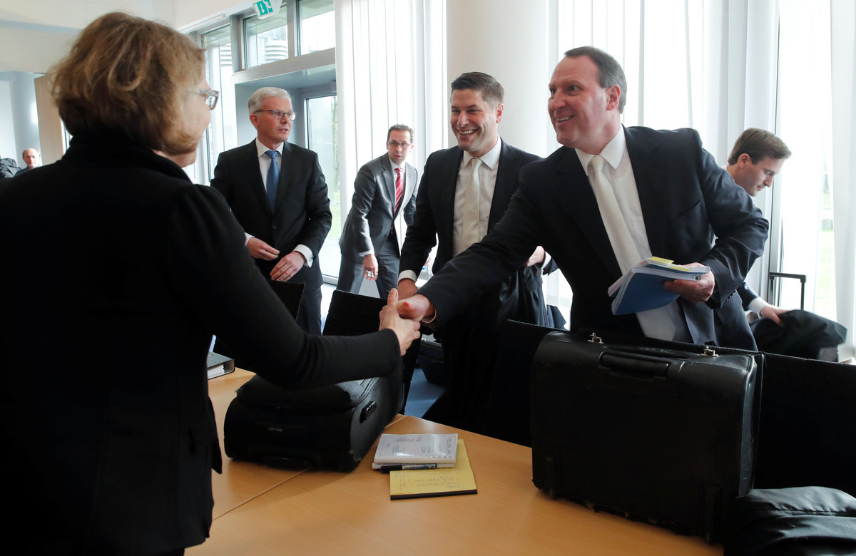 Roda Verheye, lawyer of Peruvian farmer and mountain guide Saul Luciano Lliuya (not pictured), welcomes Herbert Poster, one of five lawyers of RWE, one of Europe's biggest electricity companies, before their appeal against RWE for causing the climate change at the high regional court of Hamm, Germany, November 13, 2017. REUTERS/Wolfgang Rattay