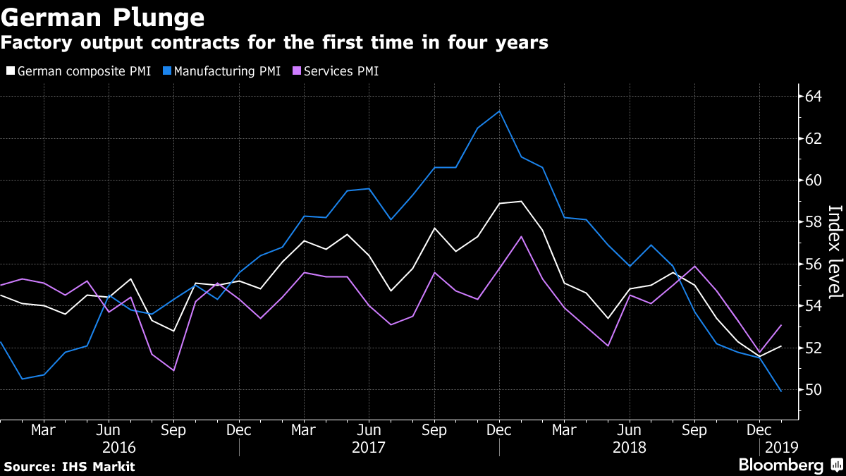 The poor reading for the IHS Markit Purchasing Managers’ Index in January will reinforce fears about the health of both the European and the global economy. That’s been a key talking point at the World Economic Forum in Davos this week, where the IMF cut its outlook and said an escalation of trade tensions could add further damage.