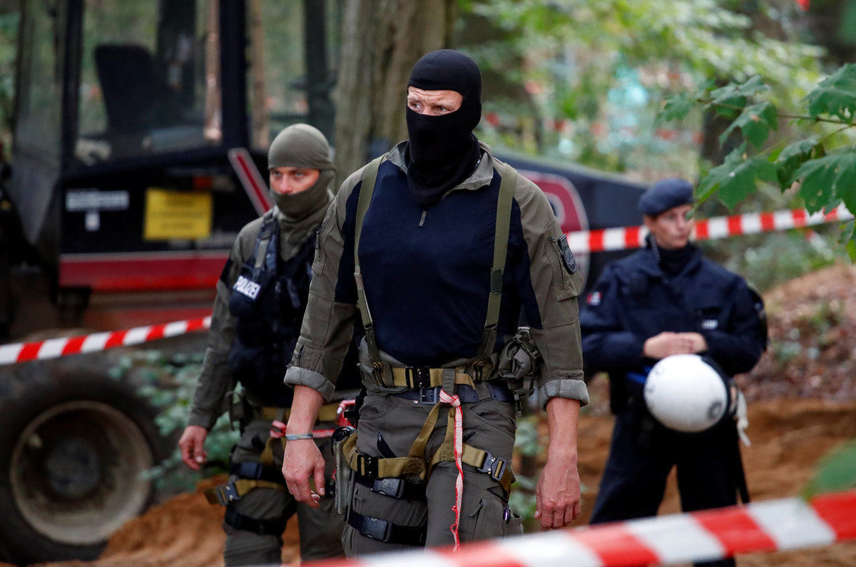 Police officers are seen in the forest as they prepare to clear the area at the "Hambacher Forst" in Kerpen-Buir near Cologne, Germany, September 13, 2018, where protesters have built a camp with tents and treehouses to stop the clearing of the Hambach forest for a nearby open cast coal mining. REUTERS/Wolfgang Rattay