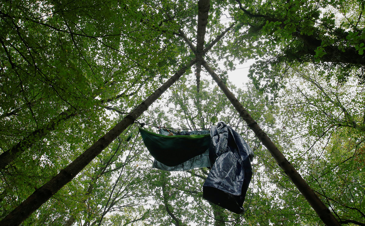 An activist hangs in a hammock between the trees as police attempt to clear the area at the "Hambacher Forst" in Kerpen-Buir near Cologne, Germany, September 13, 2018, where protesters have built a camp with tents and treehouses to stop the clearing of the Hambach forest for a nearby open cast coal mining. REUTERS/Thilo Schmuelgen