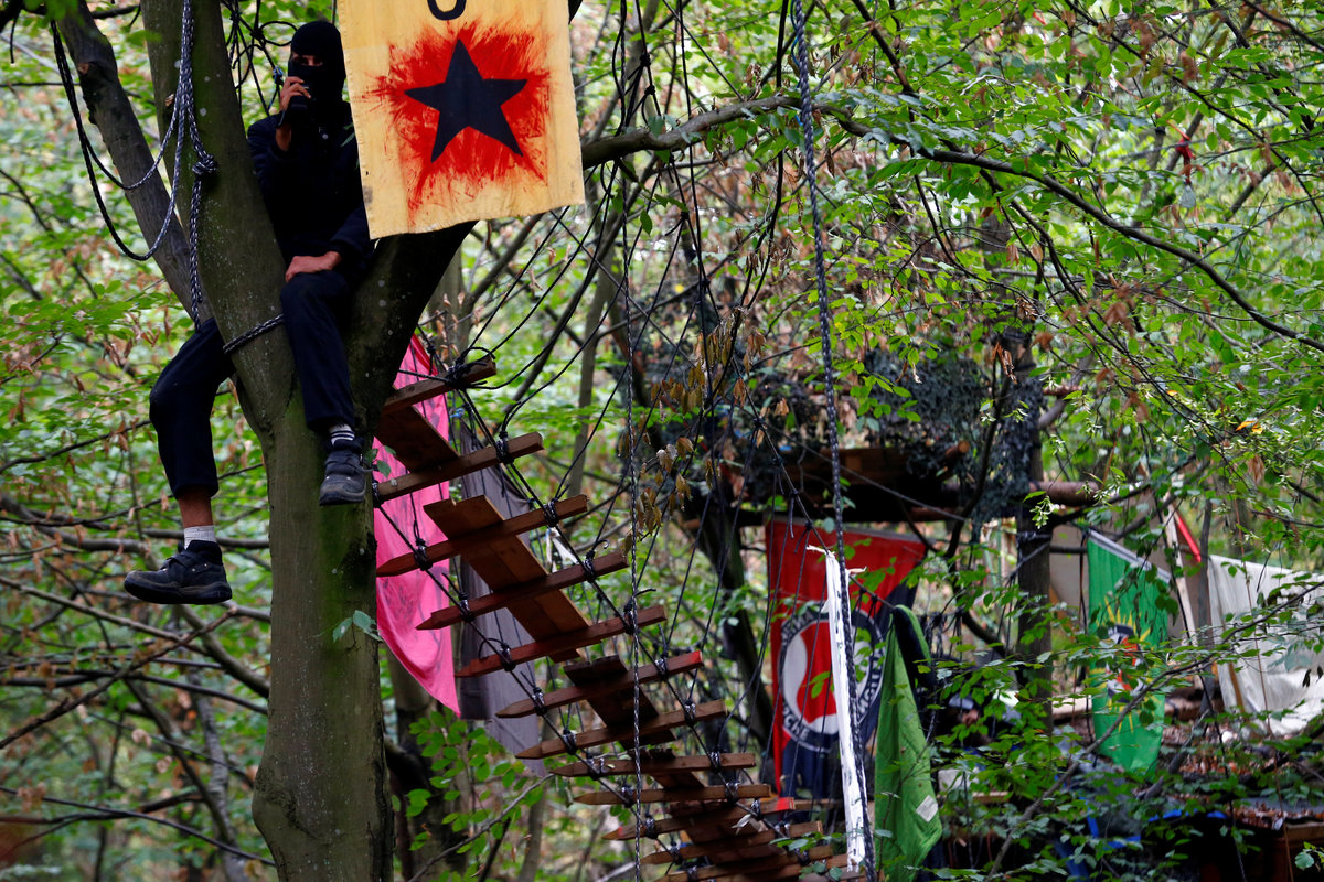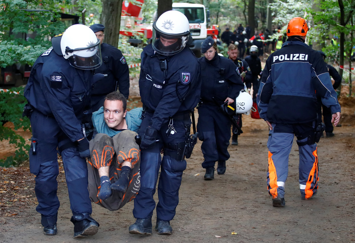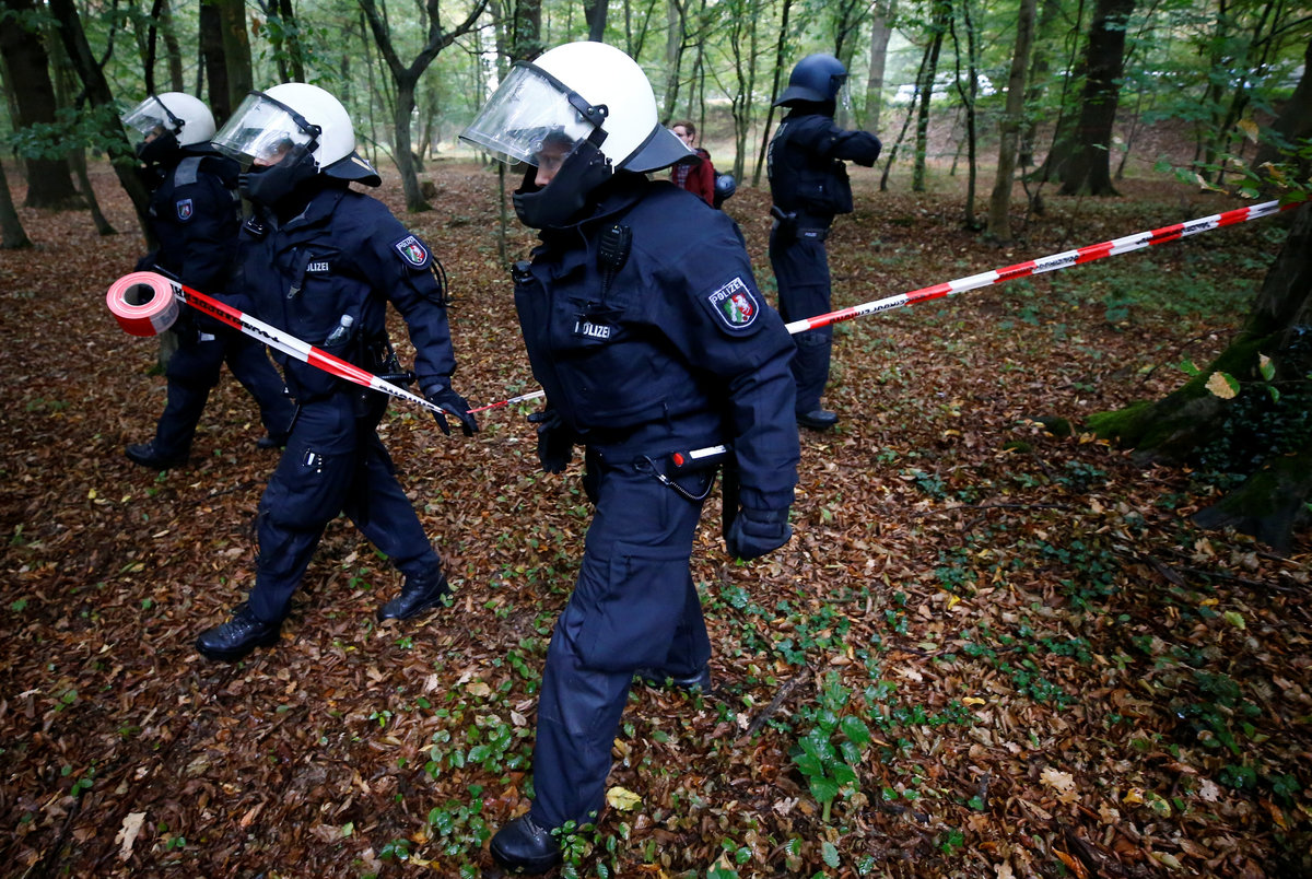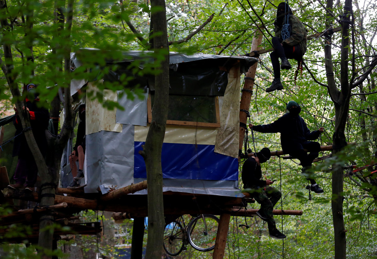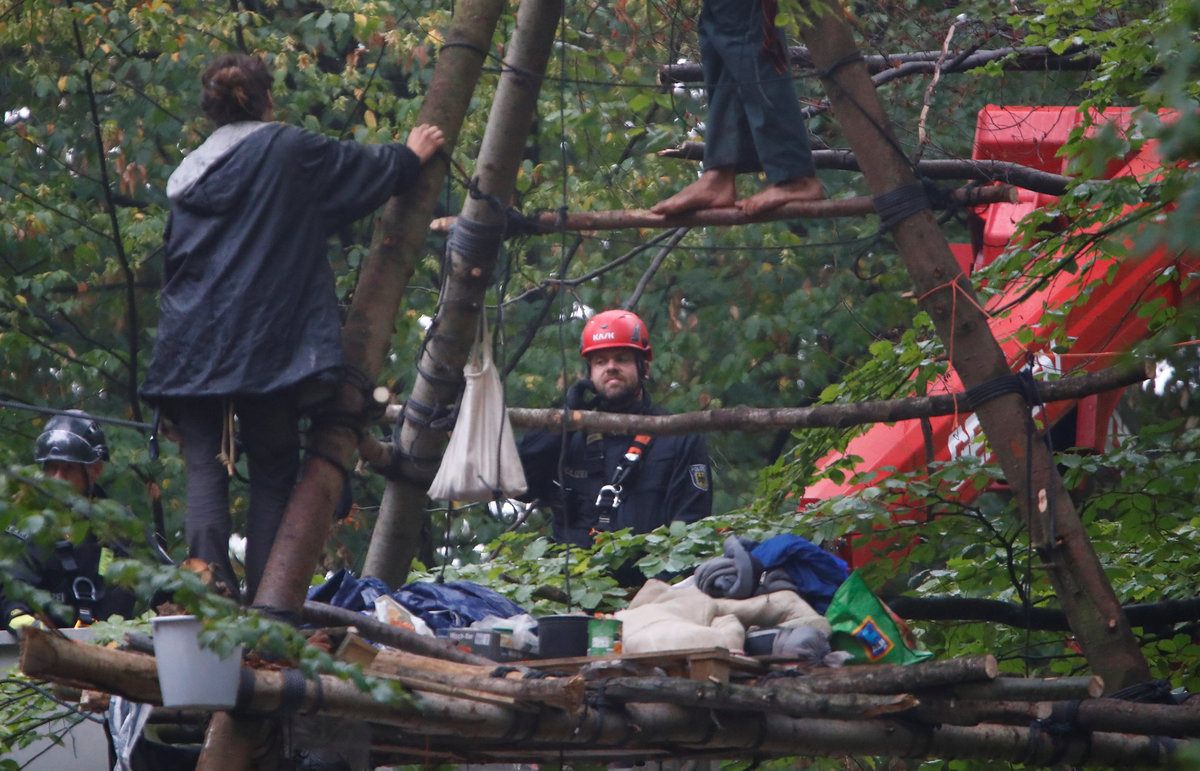 Activists are seen at the treehouse, as policemen try to clear the area at the "Hambacher Forst" in Kerpen-Buir near Cologne, Germany, September 13, 2018, where protesters have built a camp with tents and treehouses to stop the clearing of the Hambach forest for a nearby open cast coal mining. REUTERS/Wolfgang RattayPolice officers detain an activist as they attempt to clear the area at the "Hambacher Forst" in Kerpen-Buir near Cologne, Germany, September 13, 2018, where protesters have built a camp with tents and treehouses to stop the clearing of the Hambach forest for a nearby open cast coal mining. REUTERS/Wolfgang RattayPolicemen detain an activist as they attempt to clear the area at the "Hambacher Forst" in Kerpen-Buir near Cologne, Germany, September 13, 2018, where protesters have built a camp with tents and treehouses to stop the clearing of the Hambach forest for a nearby open cast coal mining. REUTERS/Wolfgang RattayPolicemen detain an activist as they attempt to clear the area at the "Hambacher Forst" in Kerpen-Buir near Cologne, Germany, September 13, 2018, where protesters have built a camp with tents and treehouses to stop the clearing of the Hambach forest for a nearby open cast coal mining. REUTERS/Wolfgang RattayPolice cordons off the zone as they prepare to clear the area at the "Hambacher Forst" in Kerpen-Buir near Cologne, Germany, September 13, 2018, where protesters have built a camp with tents and treehouses to stop the clearing of the Hambach forest for a nearby open cast coal mining. REUTERS/Wolfgang RattayPolicemen detain an activist as they attempt to clear the area at the "Hambacher Forst" in Kerpen-Buir near Cologne, Germany, September 13, 2018, where protesters have built a camp with tents and treehouses to stop the clearing of the Hambach forest for a nearby open cast coal mining. REUTERS/Wolfgang RattayA police officer carries the pipe system activists use to lock themselves as police attempt to clear the area at the "Hambacher Forst" in Kerpen-Buir near Cologne, Germany, September 13, 2018, where protesters have built a camp with tents and treehouses to stop the clearing of the Hambach forest for a nearby open cast coal mining. REUTERS/Wolfgang RattayA policeman detains an activist as police attempt to clear the area at the "Hambacher Forst" in Kerpen-Buir near Cologne, Germany, September 13, 2018, where protesters have built a camp with tents and treehouses to stop the clearing of the Hambach forest for a nearby open cast coal mining. REUTERS/Wolfgang RattayPolice officers detain an activist as they attempt to clear the area at the "Hambacher Forst" in Kerpen-Buir near Cologne, Germany, September 13, 2018, where protesters have built a camp with tents and treehouses to stop the clearing of the Hambach forest for a nearby open cast coal mining. REUTERS/Thilo SchmuelgenPolice officers detain an activist as they attempt to clear the area at the "Hambacher Forst" in Kerpen-Buir near Cologne, Germany, September 13, 2018, where protesters have built a camp with tents and treehouses to stop the clearing of the Hambach forest for a nearby open cast coal mining. REUTERS/Thilo SchmuelgenPolicemen detain an activist as they attempt to clear the area at the "Hambacher Forst" in Kerpen-Buir near Cologne, Germany, September 13, 2018, where protesters have built a camp with tents and treehouses to stop the clearing of the Hambach forest for a nearby open cast coal mining. REUTERS/Wolfgang RattayPolice armoured vehicles and a water cannon are seen at the site as police prepares to clear the area at the "Hambacher Forst" in Kerpen-Buir near Cologne, Germany, September 13, 2018, where protesters have built a camp with tents and treehouses to stop the clearing of the Hambach forest for a nearby open cast coal mining. REUTERS/Wolfgang RattayPolicemen arrest an activist as they attempt to clear the area at the "Hambacher Forst" in Kerpen-Buir near Cologne, Germany, September 13, 2018, where protesters have built a camp with tents and treehouses to stop the clearing of the Hambach forest for a nearby open cast coal mining. REUTERS/Wolfgang RattayAn activist sits in a tree as police attempt to clear the area at the "Hambacher Forst" in Kerpen-Buir near Cologne, Germany, September 13, 2018, where protesters have built a camp with tents and treehouses to stop the clearing of the Hambach forest for a nearby open cast coal mining. REUTERS/Thilo SchmuelgenPolicemen arrest an activist as they attempt to clear the area at the "Hambacher Forst" in Kerpen-Buir near Cologne, Germany, September 13, 2018, where protesters have built a camp with tents and treehouses to stop the clearing of the Hambach forest for a nearby open cast coal mining. REUTERS/Wolfgang RattayAn activist juggles the balls at the treehouse, as police forces prepare to clear the area at the "Hambacher Forst" in Kerpen-Buir near Cologne, Germany, September 13, 2018, where protesters have built a camp with tents and treehouses to stop the clearing of the Hambach forest for a nearby open cast coal mining. REUTERS/Wolfgang RattayPolice officers make a selfie as they prepare to clear the area at the "Hambacher Forst" in Kerpen-Buir near Cologne, Germany, September 13, 2018, where protesters have built a camp with tents and treehouses to stop the clearing of the Hambach forest for a nearby open cast coal mining. REUTERS/Wolfgang RattayAn activist runs through the forest as police prepares to clear the area at the "Hambacher Forst" in Kerpen-Buir near Cologne, Germany, September 13, 2018, where protesters have built a camp with tents and treehouses to stop the clearing of the Hambach forest for a nearby open cast coal mining. REUTERS/Wolfgang RattayPolicemen in the crane lift approach an activist at the treehouse, as they attempt to clear the area at the "Hambacher Forst" in Kerpen-Buir near Cologne, Germany, September 13, 2018, where protesters have built a camp with tents and treehouses to stop the clearing of the Hambac