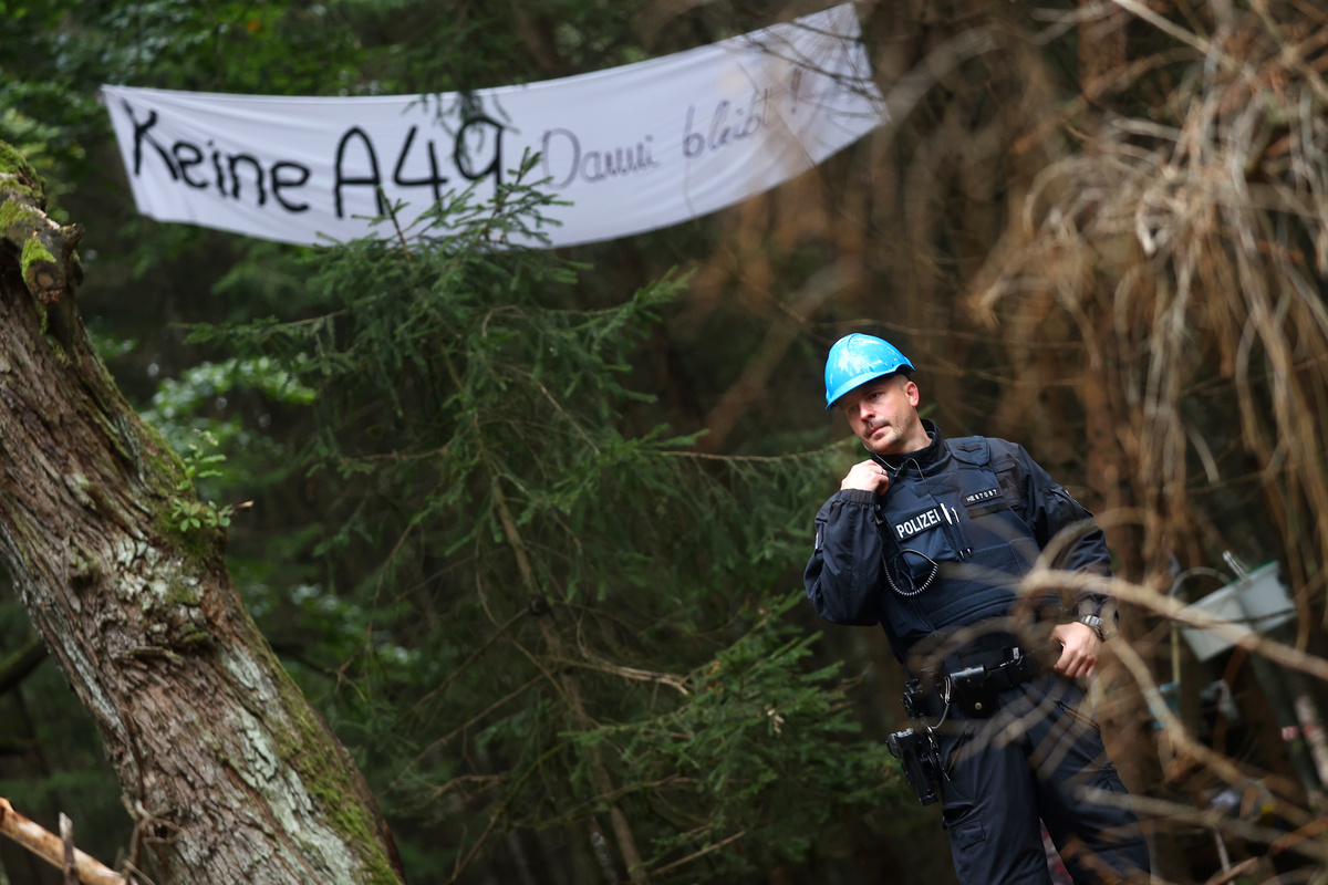 Dozens of police officers were deployed to the Dannenroeder forest north of Frankfurt to protect the workers and to remove the activists, who have built tree houses and erected barricades in the area to try to prevent the felling.