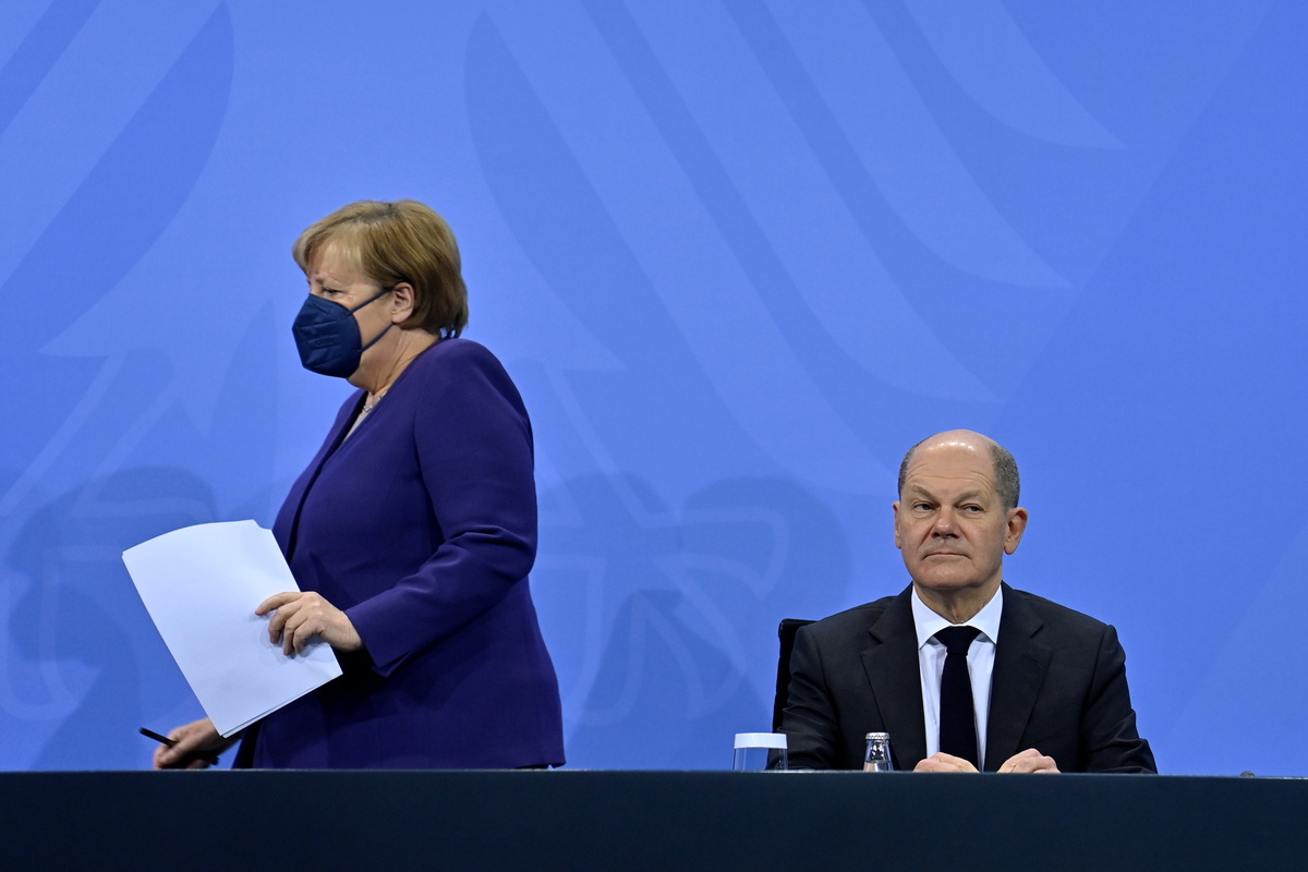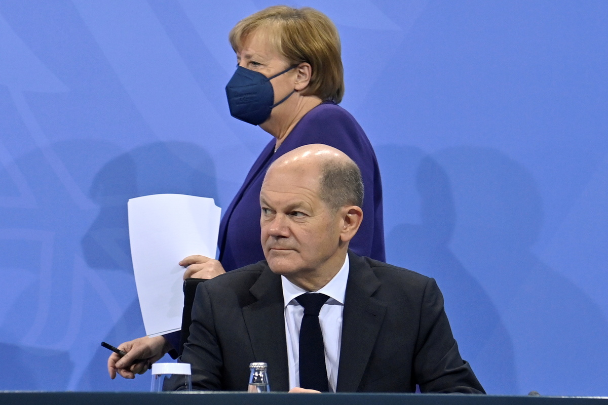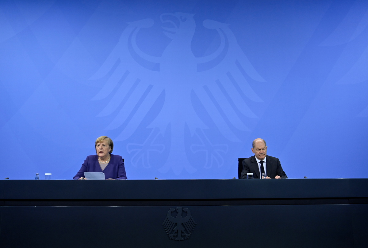 German Chancellor Angela Merkel (L) and her designated successor Olaf Scholz (R) address a press conference following a meeting with the heads of government of Germany's federal states at the Chancellery in Berlin, Germany December 2, 2021. John MacDougall/Pool via REUTERS