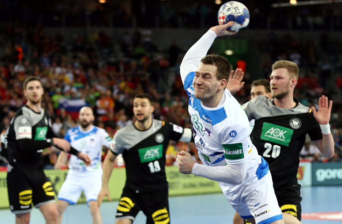 Handball - Men's EHF European Handball Championship - preliminary round Group C - Slovenia v Germany - Arena Zagreb, Zagreb, Croatia - January 15, 2018. Miha Zarabec of Slovenia shoots on goal. REUTERS/Antonio Bronic