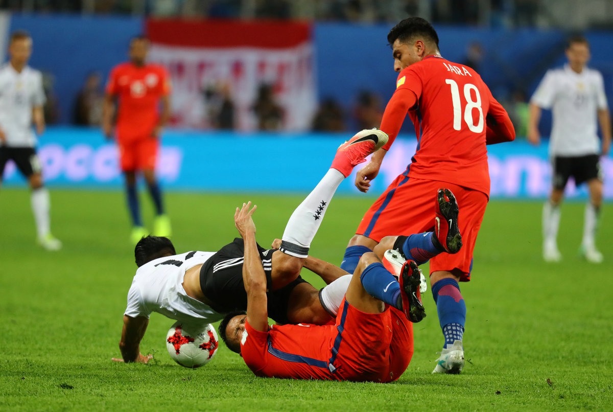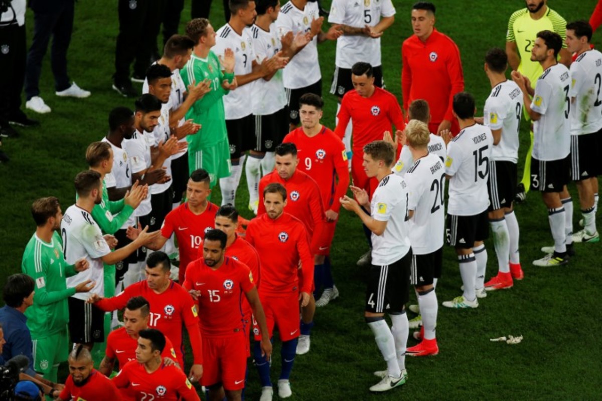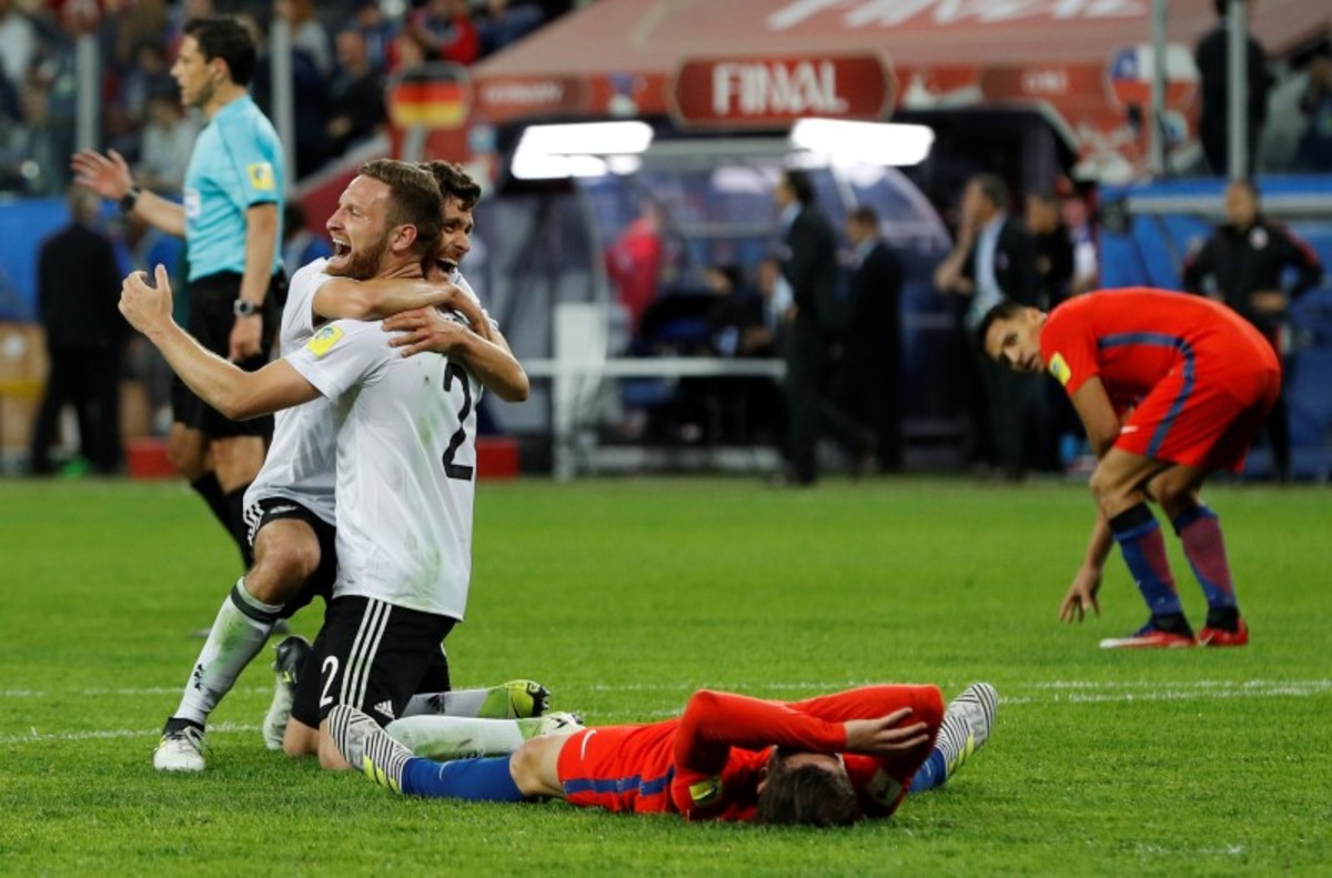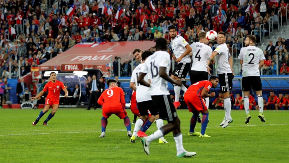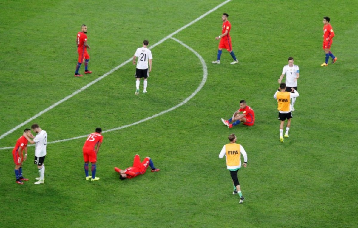 Soccer Football - Chile v Germany - FIFA Confederations Cup Russia 2017 - Final - Saint Petersburg Stadium, St. Petersburg, Russia - July 2, 2017 Germany’s Shkodran Mustafi consoles Chile’s Alexis Sanchez (L) at the end of the match as Gary Medel and team mates look dejected REUTERS/Maxim ShemetovSoccer Football - Chile v Germany - FIFA Confederations Cup Russia 2017 - Final - Saint Petersburg Stadium, St. Petersburg, Russia - July 2, 2017 Germany’s Matthias Ginter and team mates celebrate winning the FIFA Confederations Cup REUTERS/Grigory DukorSoccer Football - Chile v Germany - FIFA Confederations Cup Russia 2017 - Final - Saint Petersburg Stadium, St. Petersburg, Russia - July 2, 2017 Chile’s Alexis Sanchez shoots at goal from a free kick REUTERS/Kai PfaffenbachSoccer Football - Chile v Germany - FIFA Confederations Cup Russia 2017 - Final - Saint Petersburg Stadium, St. Petersburg, Russia - July 2, 2017 Germany’s Lars Stindl celebrates scoring their first goal as Chile’s Claudio Bravo looks dejected REUTERS/Grigory DukorSoccer Football - Chile v Germany - FIFA Confederations Cup Russia 2017 - Final - Saint Petersburg Stadium, St. Petersburg, Russia - July 2, 2017 Chile’s Alexis Sanchez shoots at goal from a free kick REUTERS/Darren StaplesSoccer Football - Chile v Germany - FIFA Confederations Cup Russia 2017 - Final - Saint Petersburg Stadium, St. Petersburg, Russia - July 2, 2017 Chile’s Gonzalo Jara and Alexis Sanchez in action with Germany’s Emre Can REUTERS/Kai PfaffenbachSoccer Football - Chile v Germany - FIFA Confederations Cup Russia 2017 - Final - Saint Petersburg Stadium, St. Petersburg, Russia - July 2, 2017. Chile's Claudio Bravo reacts after Germany's Lars Stindl scored their first goal. REUTERS/Darren StaplesSoccer Football - Chile v Germany - FIFA Confederations Cup Russia 2017 - Final - Saint Petersburg Stadium, St. Petersburg, Russia - July 2, 2017 Germany’s Joshua Kimmich and Sebastian Rudy appeal to the referee Milorad Mazic as Chile’s Alexis Sanchez gestures REUTERS/Maxim ShemetovSoccer Football - Chile v Germany - FIFA Confederations Cup Russia 2017 - Final - Saint Petersburg Stadium, St. Petersburg, Russia - July 2, 2017. Germany's Lars Stindl and Chile's Gary Medel in action. REUTERS/Kai PfaffenbachSoccer Football - Chile v Germany - FIFA Confederations Cup Russia 2017 - Final - Saint Petersburg Stadium, St. Petersburg, Russia - July 2, 2017 Chile’s Alexis Sanchez in action with Germany’s Emre Can REUTERS/Maxim ShemetovSoccer Football - Chile v Germany - FIFA Confederations Cup Russia 2017 - Final - Saint Petersburg Stadium, St. Petersburg, Russia - July 2, 2017 Chile’s Gary Medel and Gonzalo Jara try to grab the ball from Germany’s Emre Can REUTERS/Maxim Shemetov