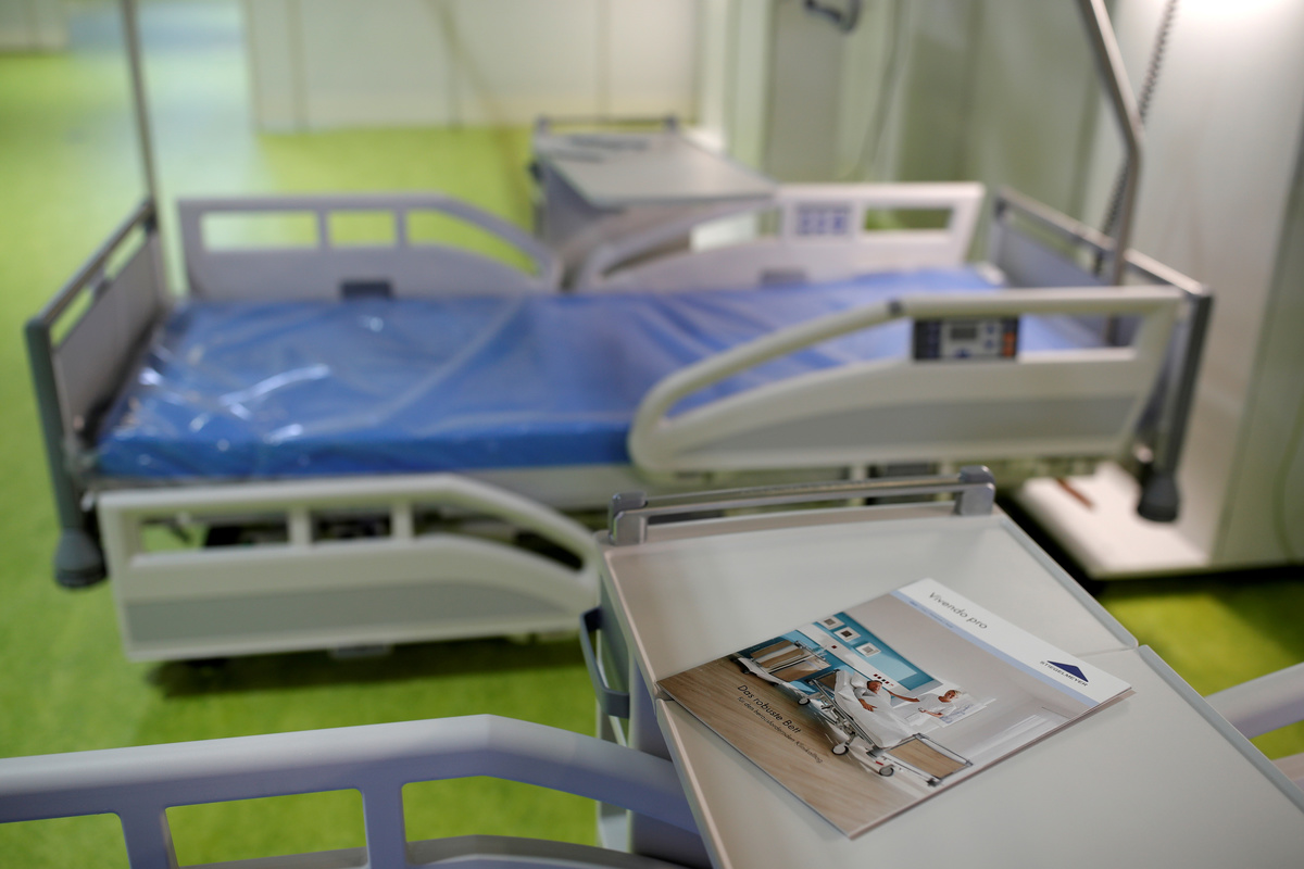 FILE PHOTO: A leaflet is pictured next to a bed at the "Corona Treatment Center Jaffestrasse" makeshift hospital being set up at the fairgrounds to treat patients following an outbreak of the coronavirus disease (COVID-19), in Berlin, Germany April 23, 2020. Odd Andersen/Pool via REUTERS