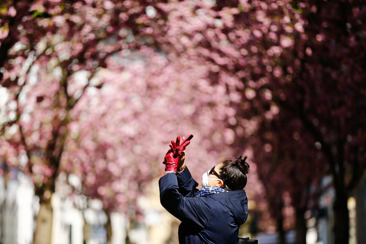 FILE PHOTO: A woman takes a picture at the Cherry Blossom Area, a magnet for tourists from all over the world during blossom-time of the cherry trees, as the spread of the coronavirus disease (COVID-19) continues in Bonn, Germany, April 8, 2020. REUTERS/Thilo Schmuelgen