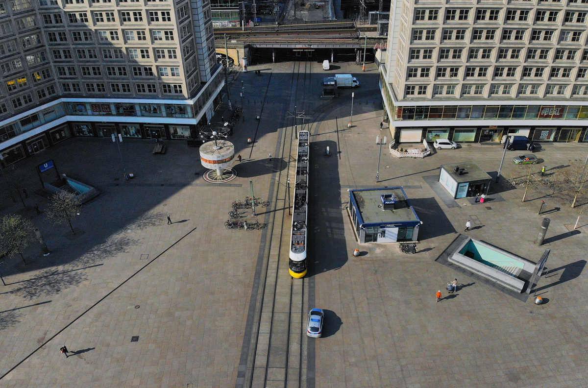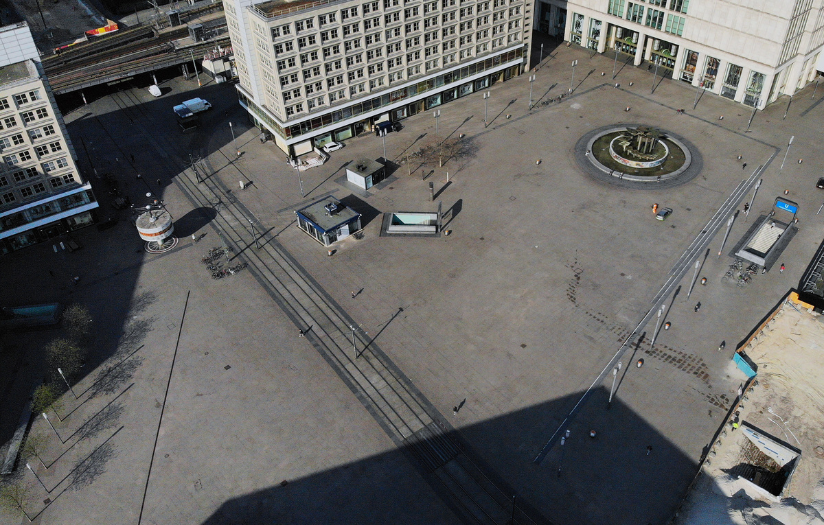 An aerial view shows the empty Alexanderplatz square, as the spread of the coronavirus disease (COVID-19) continues in Berlin, Germany, April 8, 2020. Picture taken with a drone, April 8, 2020. REUTERS/Hannibal HanschkeAn aerial view shows the Victory Column (Siegessaeule) square, as the spread of the coronavirus disease (COVID-19) continues in Berlin, Germany, April 8, 2020. Picture taken with a drone, April 8, 2020. REUTERS/Hannibal HanschkeAn aerial view shows the Karl-Marx-Allee boulevard, as the spread of the coronavirus disease (COVID-19) continues in Berlin, Germany, April 8, 2020. Picture taken with a drone, April 8, 2020. REUTERS/Axel SchmidtAn aerial view shows the Straussberger Platz square, as the spread of the coronavirus disease (COVID-19) continues in Berlin, Germany, April 8, 2020. Picture taken with a drone, April 8, 2020. REUTERS/Axel SchmidtAn aerial view shows the Straussberger Platz square, as the spread of the coronavirus disease (COVID-19) continues in Berlin, Germany, April 8, 2020. Picture taken with a drone, April 8, 2020. REUTERS/Axel SchmidtAn aerial view shows the Karl-Marx-Allee boulevard, as the spread of the coronavirus disease (COVID-19) continues in Berlin, Germany, April 8, 2020. Picture taken with a drone, April 8, 2020. REUTERS/Axel Schmidt