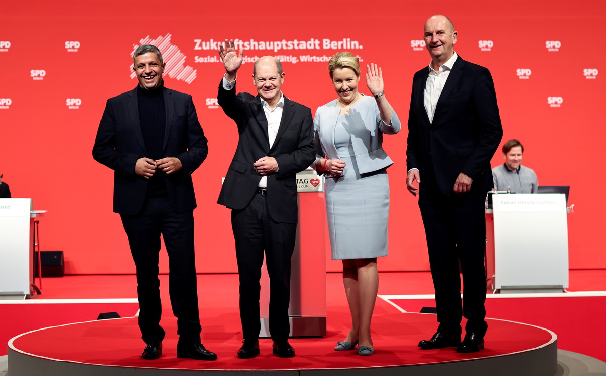 Raed Saleh, candidate for Chancellor Olaf Scholz, candidate for mayor of Berlin Franziska Giffey and Brandenburg State Premier Dietmar Woidke of Germany's Social Democratic Party (SPD) attend a party convention in Berlin, Germany, December 5, 2021. REUTERS/Christian Mang