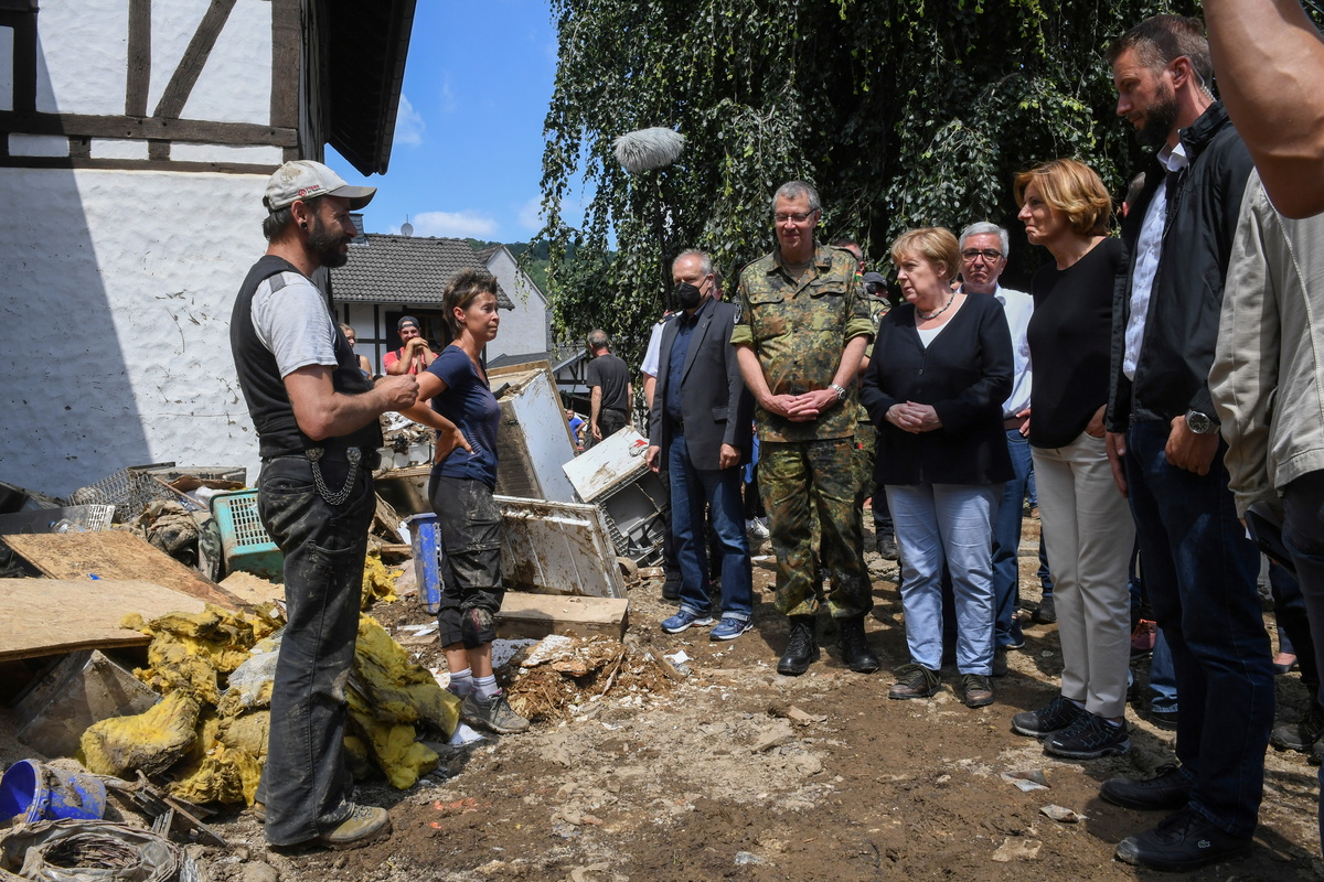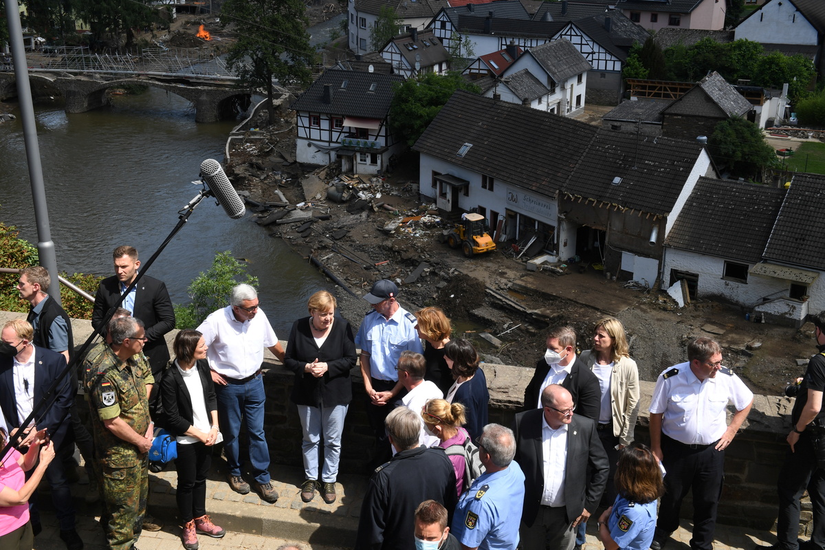 German Chancellor Angela Merkel and Rhineland-Palatinate State Premier Malu Dreyer talk to residents standing amid debris during their visit in the flood-ravaged village of Schuld near Bad Neuenahr-Ahrweiler, Rhineland-Palatinate state, Germany, July 18, 2021. Christof Stache/Pool via REUTERSGerman Chancellor Angela Merkel and Rhineland-Palatinate State Premier Malu Dreyer walk through the flood-ravaged village of Schuld near Bad Neuenahr-Ahrweiler, Rhineland-Palatinate state, Germany, July 18, 2021. Christof Stache/Pool via REUTERSGerman Chancellor Angela Merkel and Rhineland-Palatinate State Premier Malu Dreyer speak to people as they stand on a bridge during their visit in the flood-ravaged areas, in Schuld near Bad Neuenahr-Ahrweiler, Rhineland-Palatinate state, Germany, July 18, 2021. Christof Stache/Pool via REUTERS
