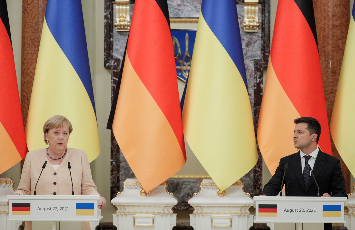 German Chancellor Angela Merkel discussed the security situation on Ukraine's border with Russia with President Volodymyr Zelenskiy, assuring him of her support for Ukraine's independence and territorial integrity, her spokesperson said.