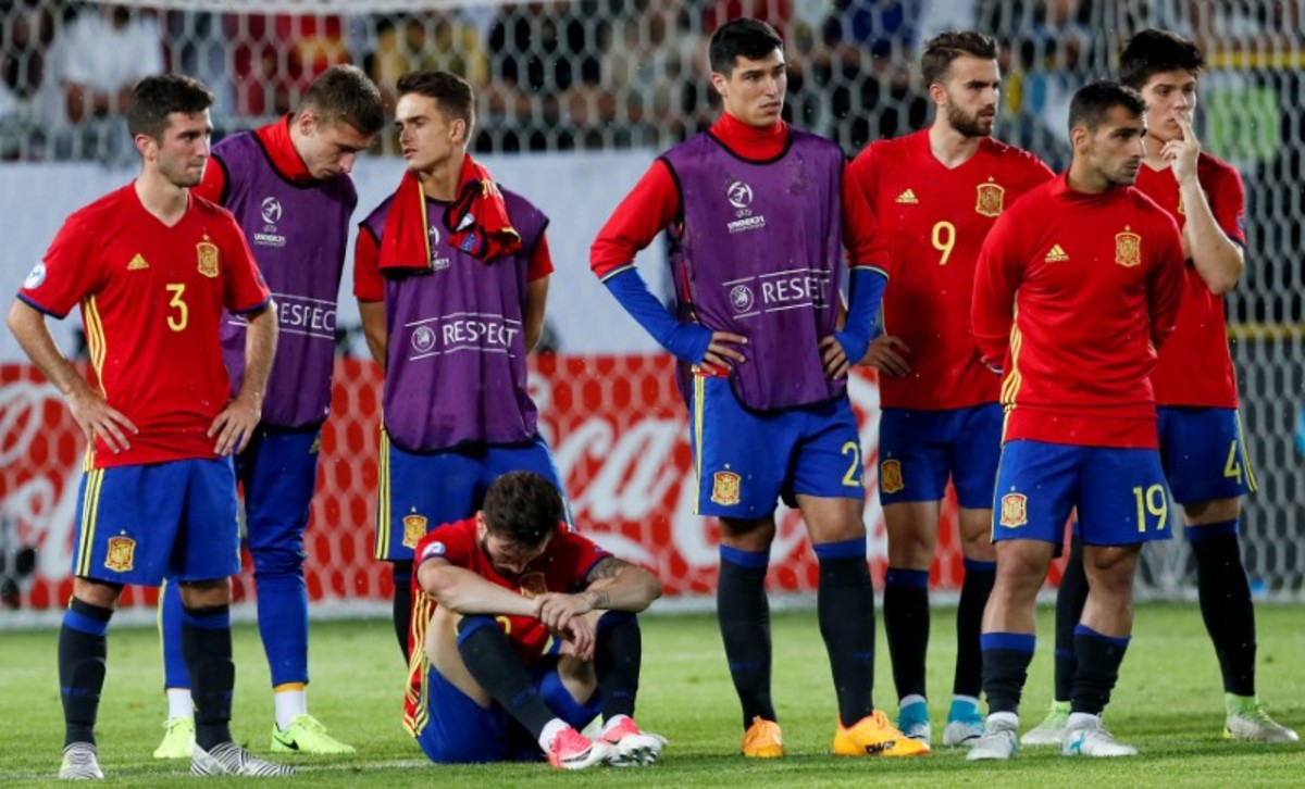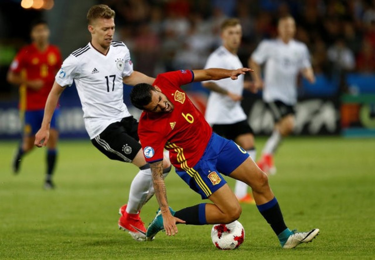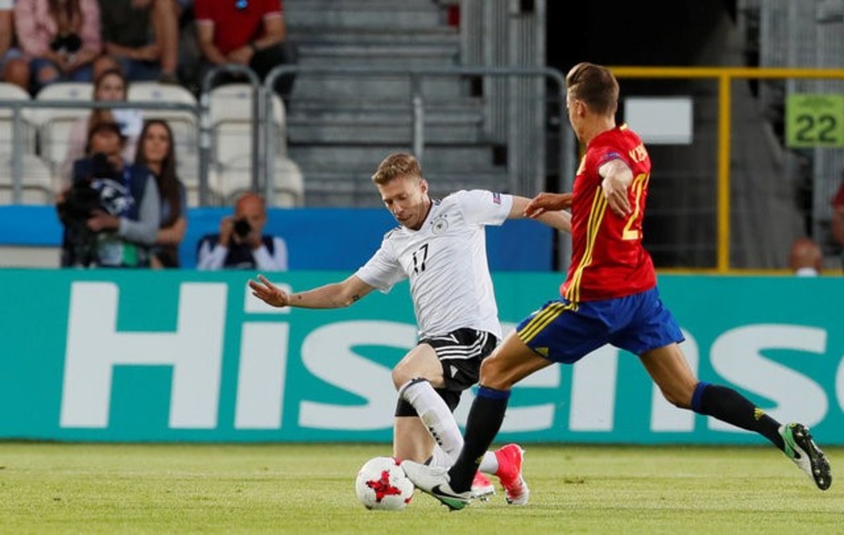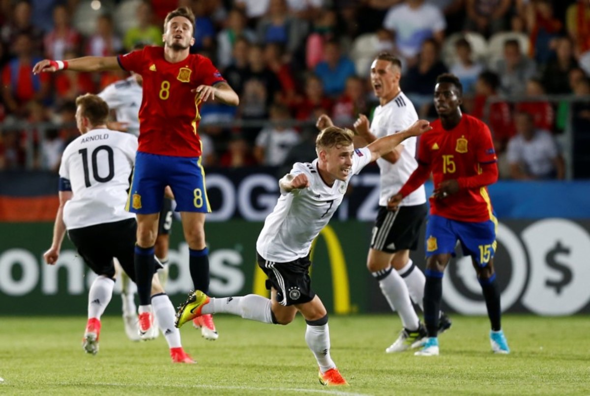 Soccer Football - Germany v Spain - UEFA Euro U21 Championships Final - Cracovia Stadium, Krakow, Poland - 30 June 2017. Spain's players react after the match. REUTERS/Andrzej IwanczukSoccer Football - Germany v Spain - UEFA Euro U21 Championships Final - Cracovia Stadium, Krakow, Poland - 30 June 2017. Germany's Mitchell Weiser in action with Spain's Marco Asensio and Dani Ceballos. REUTERS/Andrzej IwanczukSoccer Football - Germany v Spain - UEFA Euro U21 Championships Final - Cracovia Stadium, Krakow, Poland - 30 June 2017. Spain's goalkeeper Kepa Arrizabalaga looks at the ball in the net after Germany's Mitchell Weiser scored. REUTERS/Andrzej IwanczukSoccer Football - Germany v Spain - UEFA Euro U21 Championships Final - Cracovia Stadium, Krakow, Poland - 30 June 2017. Spain's Marcos Llorente and Germany's Mitchell Weiser in action. REUTERS/Andrzej IwanczukSoccer Football - Germany v Spain - UEFA Euro U21 Championships Final - Cracovia Stadium, Krakow, Poland - 30 June 2017. Germany's Mitchell Weiser and Spain's Dani Ceballos in action. REUTERS/Kacper PempelSoccer Football - Germany v Spain - UEFA Euro U21 Championships Final - Cracovia Stadium, Krakow, Poland - 30 June 2017. Germany's Mitchell Weiser celebrates with his teammates after scoring a goal. REUTERS/Andrzej Iwanczuk