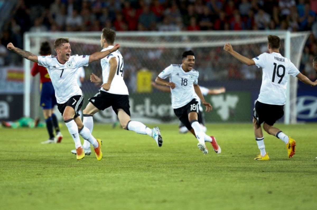 Soccer Football - Germany v Spain - UEFA Euro U21 Championships Final - Cracovia Stadium, Krakow, Poland - 30 June 2017. Germany's players celebrate after winning the match as Spain's players react. REUTERS/Kacper Pempel