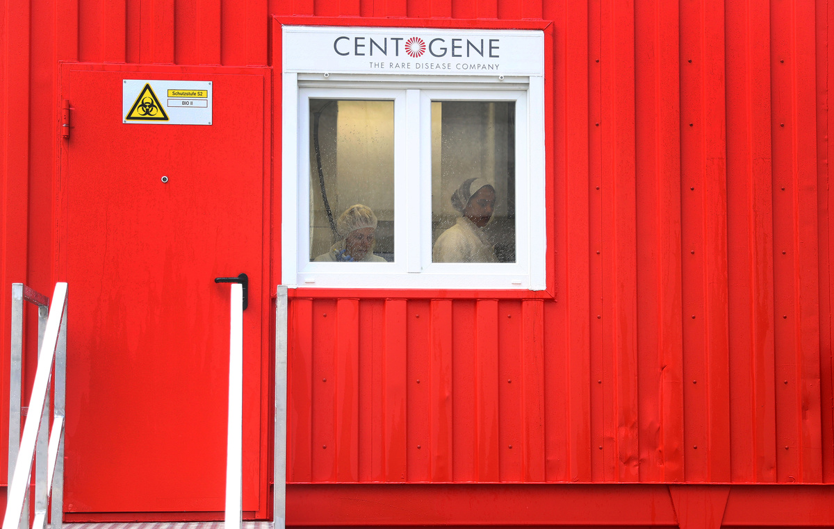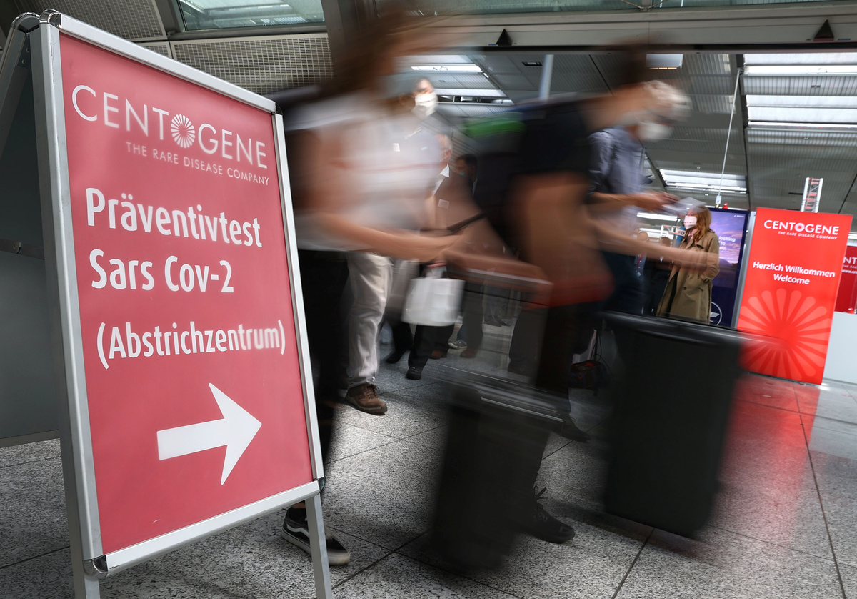 Employees of the diagnostics provider Centogene work inside a container housing their mobile laboratory at Germany's first walk-through the coronavirus disease (COVID-19) test center which is opened in cooperation with air carrier Lufthansa and Fraport at the airport in Frankfurt, Germany, June 29, 2020. REUTERS/Kai PfaffenbachA saliva sample is registered at Germany's first walk-through the coronavirus disease (COVID-19) test center which is opened by diagnostics provider Centogene in cooperation with air carrier Lufthansa and Fraport at the airport in Frankfurt, Germany June 29, 2020. REUTERS/Kai PfaffenbachTravellers rush past the entry of Germany's first walk-through the coronavirus disease (COVID-19) test center which is opened by diagnostics provider Centogene in cooperation with air carrier Lufthansa and Fraport at the airport in Frankfurt, Germany June 29, 2020. REUTERS/Kai Pfaffenbach