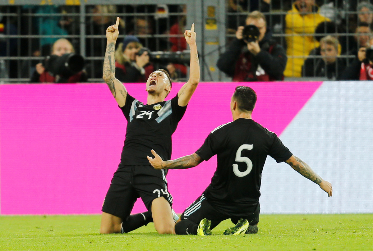 Soccer Football - International Friendly - Germany v Argentina - Signal Iduna Park, Dortmund, Germany - October 9, 2019 Argentina's Lucas Alario celebrates scoring their first goal REUTERS/Leon Kuegeler