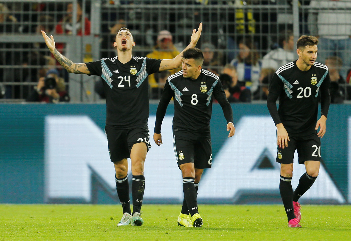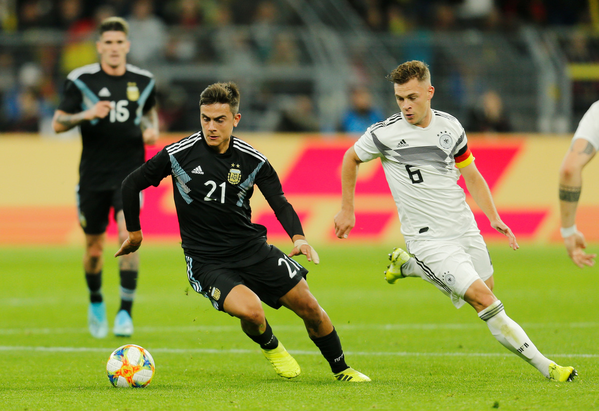 Soccer Football - International Friendly - Germany v Argentina - Signal Iduna Park, Dortmund, Germany - October 9, 2019 Argentina's Lucas Ocampos celebrates scoring their second goal with team mates REUTERS/Leon Kuegeler DFB regulations prohibit any use of photographs as image sequences and/or quasi-videoSoccer Football - International Friendly - Germany v Argentina - Signal Iduna Park, Dortmund, Germany - October 9, 2019 Germany coach Joachim Low REUTERS/Leon Kuegeler DFB regulations prohibit any use of photographs as image sequences and/or quasi-videoSoccer Football - International Friendly - Germany v Argentina - Signal Iduna Park, Dortmund, Germany - October 9, 2019 Germany's Kai Havertz scores their second goal REUTERS/Leon Kuegeler DFB regulations prohibit any use of photographs as image sequences and/or quasi-videoSoccer Football - International Friendly - Germany v Argentina - Signal Iduna Park, Dortmund, Germany - October 9, 2019 Argentina's Nicolas Tagliafico in action with Germany's Julian Brandt REUTERS/Leon Kuegeler Soccer Football - International Friendly - Germany v Argentina - Signal Iduna Park, Dortmund, Germany - October 9, 2019 Argentina's Paulo Dybala in action with Germany's Joshua Kimmich REUTERS/Leon Kuegeler