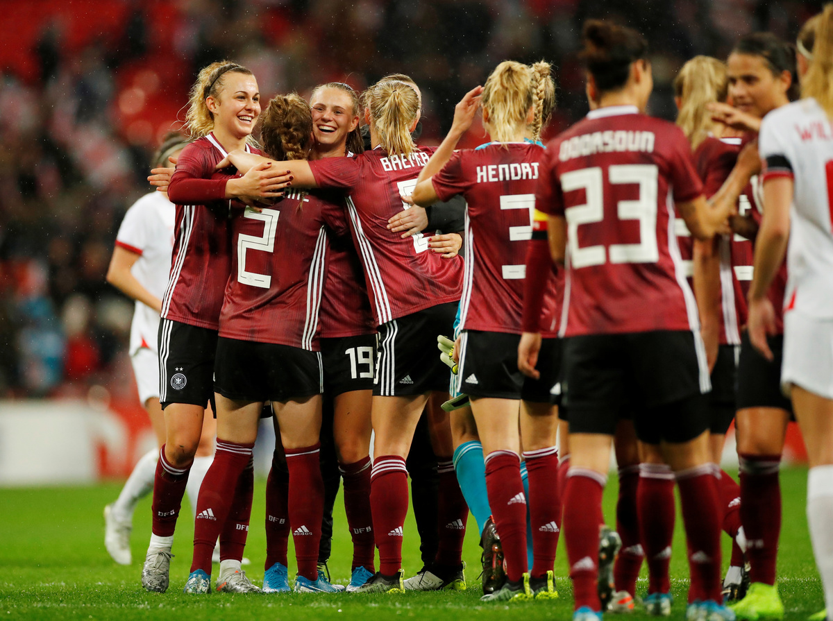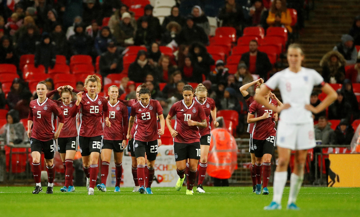Soccer Football - Women's International Friendly - England v Germany - Wembley Stadium, London, Britain - November 9, 2019 Germany players celebrate after the match Action Images via Reuters/Andrew BoyersSoccer Football - Women's International Friendly - England v Germany - Wembley Stadium, London, Britain - November 9, 2019 England team huddle after the match Action Images via Reuters/Andrew BoyersSoccer Football - Women's International Friendly - England v Germany - Wembley Stadium, London, Britain - November 9, 2019 England players during a minutes silence as part of remembrance commemorations before the match Action Images via Reuters/Andrew Boyers