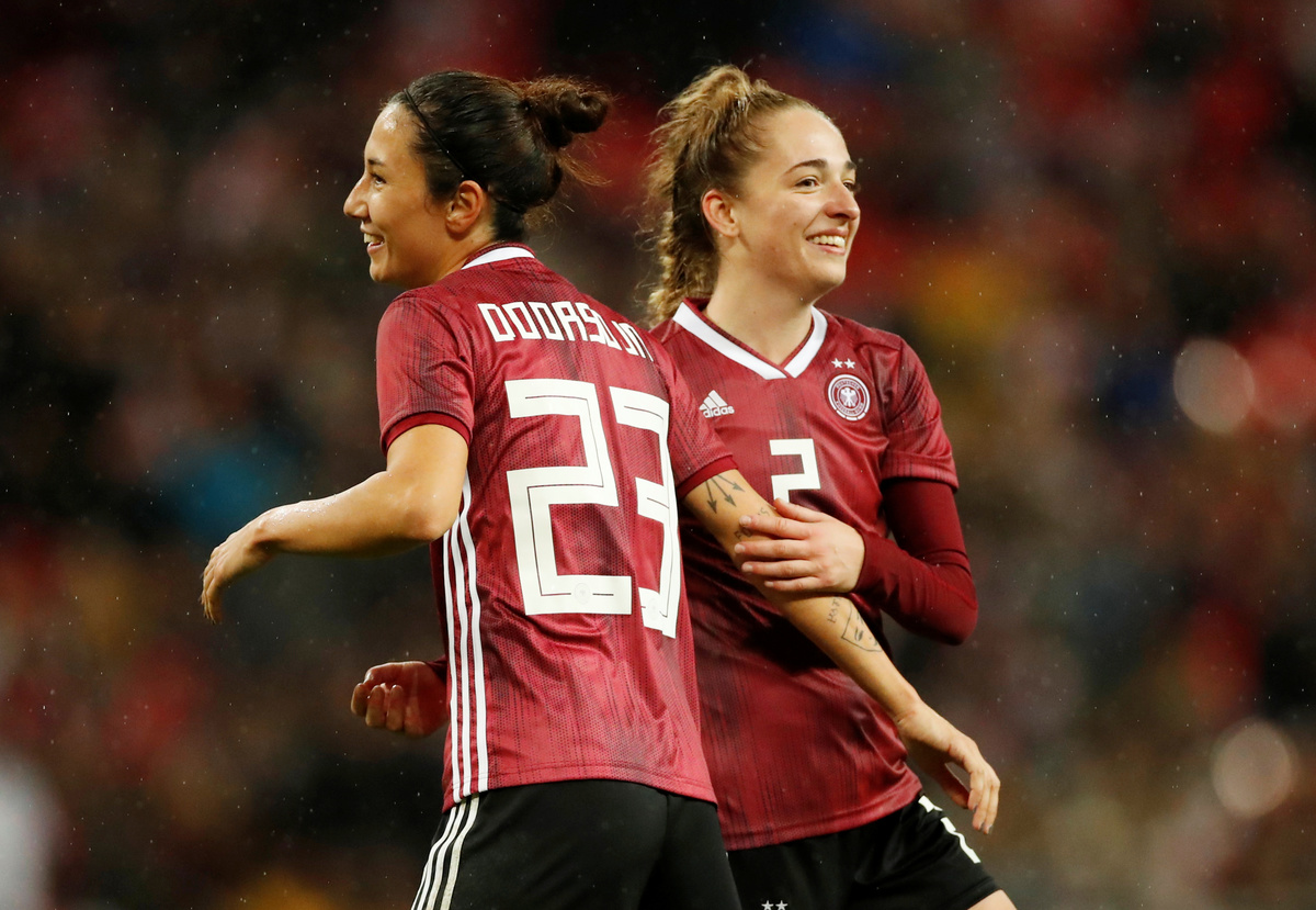 Soccer Football - Women's International Friendly - England v Germany - Wembley Stadium, London, Britain - November 9, 2019 Germany's Sara Doorsoun celebrates with Sophia Kleinherne at the end of the match Action Images via Reuters/Andrew Boyers