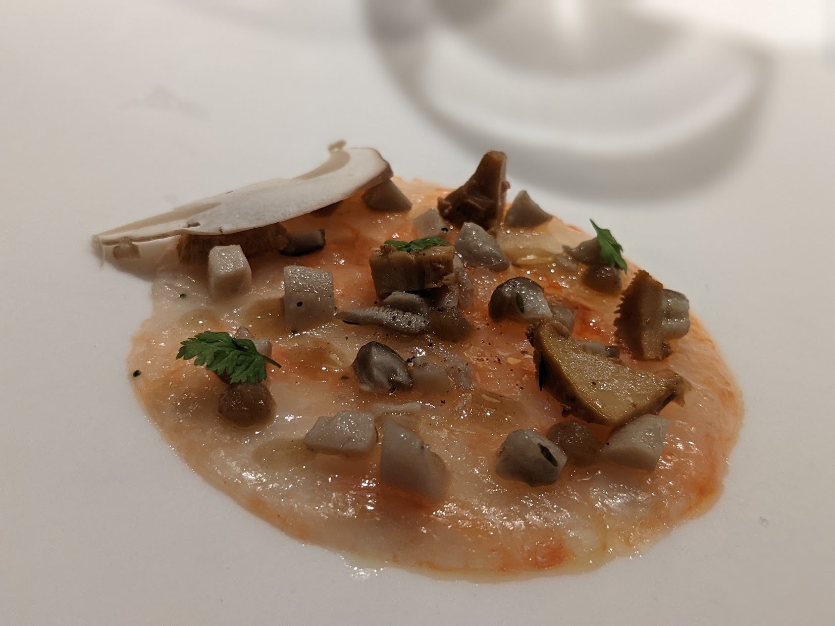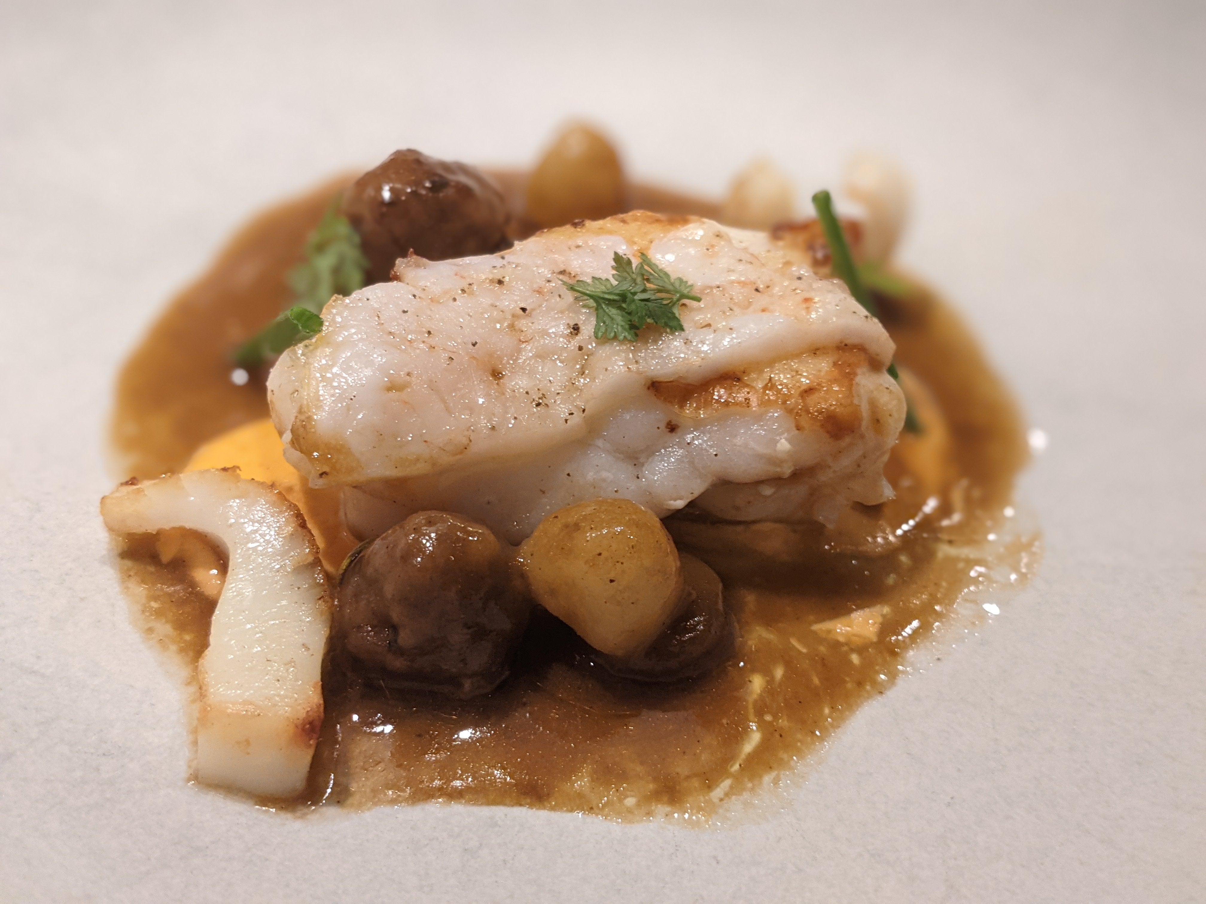 The opening number, a crispy, pea-topped cracker of baby shrimp with plankton mayonnaise, served alongside a miraculous ‘bursting olive’ wrought with anchovy flavour is an education for my amateur tastebuds.