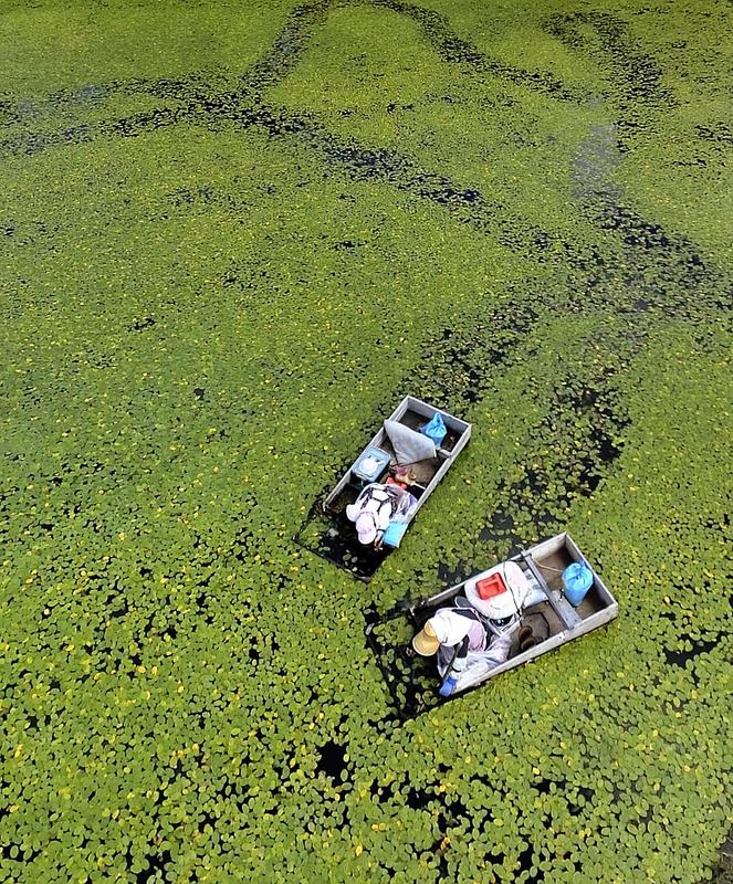 A pair of workers on wooden boats pluck buds from junsai edible water plants at a pond in Mitane, Akita Prefecture, on Thursday. The plant is popular for its sleek texture, with Mitane accounting for 90 percent of junsai production in Japan. The junsai harvest began as usual at the beginning of May and will continue through August.