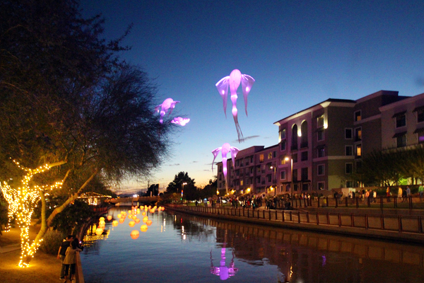 Our hotel concierge had recommended we visit the Scottsdale Waterfront that evening to enjoy the Canal Convergence, an annual, free event that showcases large-scale interactive artworks by local and international artists. We arrived just at sunset, and our first view of Scottsdale's historic Arizona canal and waterfront area couldn't have been more dramatic. The vibrant lights illuminating the walkways and the artistic balloons swaying above the canal created an almost surreal image of this chic and architecturally innovative area of downtown.