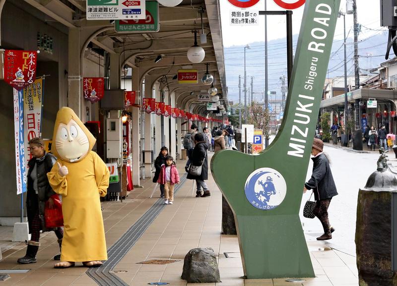 Along the road are a yokai shrine and souvenir shops paying homage to characters such as Kitaro's father, Medamaoyaji, or the half-human, half-yokai Nezumiotoko.