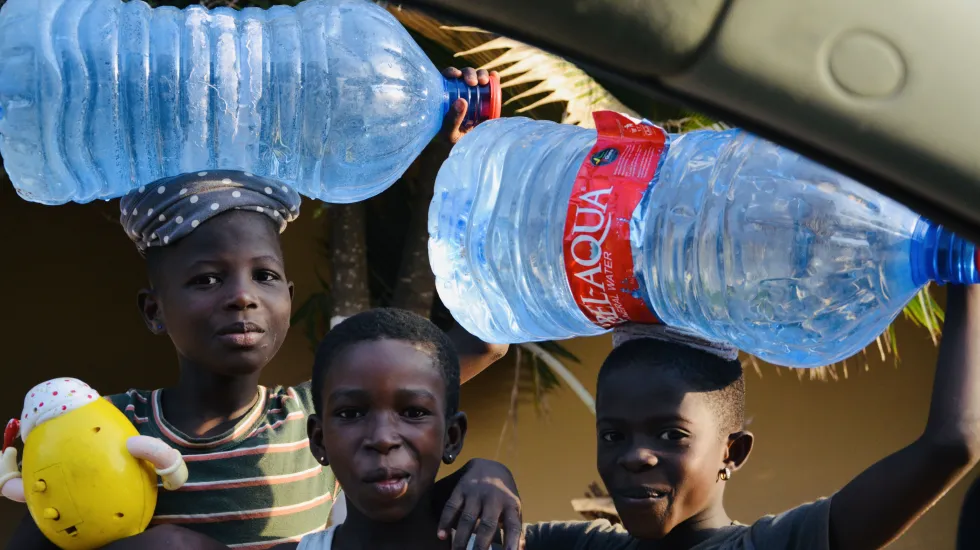 Without complaint and with no detectable frown, the children here carry water. In the evenings after school. I see them: Little boys and little girls with sunbaked skin and innocent brown eyes. With assorted filled bottles and buckets. Lifted high. Carried on their heads with transparent ease. Along these red dirt and sand-laden rugged streets.
