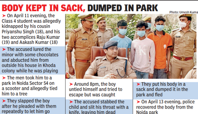 SP (crime) Diksha Sharma told TOI the 10-year-old boy was playing outside his house around 6pm on April 11 when Priyanshu lured him with a piece of chocolate. The 10-year-old was last seen on a scooter with Priyanshu and the two other accused.