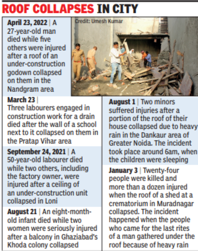 GHAZIABAD: A 27-year-old labourer died and five others were injured after the roof of an under-construction godown collapsed on them in Nandgram area of Ghaziabad on Saturday afternoon. Initial investigation revealed that the godown was being constructed illegally and its layout map was not approved by the Ghaziabad Development Authority.