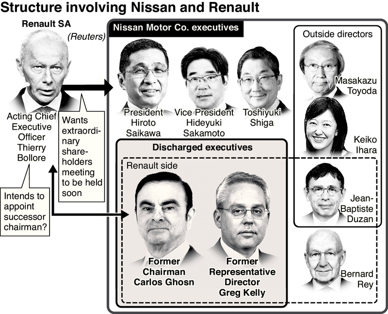Nissan Motor Co. put off choosing a replacement for former Chairman Carlos Ghosn at its board meeting Monday. Should top Nissan shareholder Renault SA of France heighten its demands regarding the appointment of a chairman, in a bid to retain its influence over Nissan, the battle between the two firms is certain to intensify.
