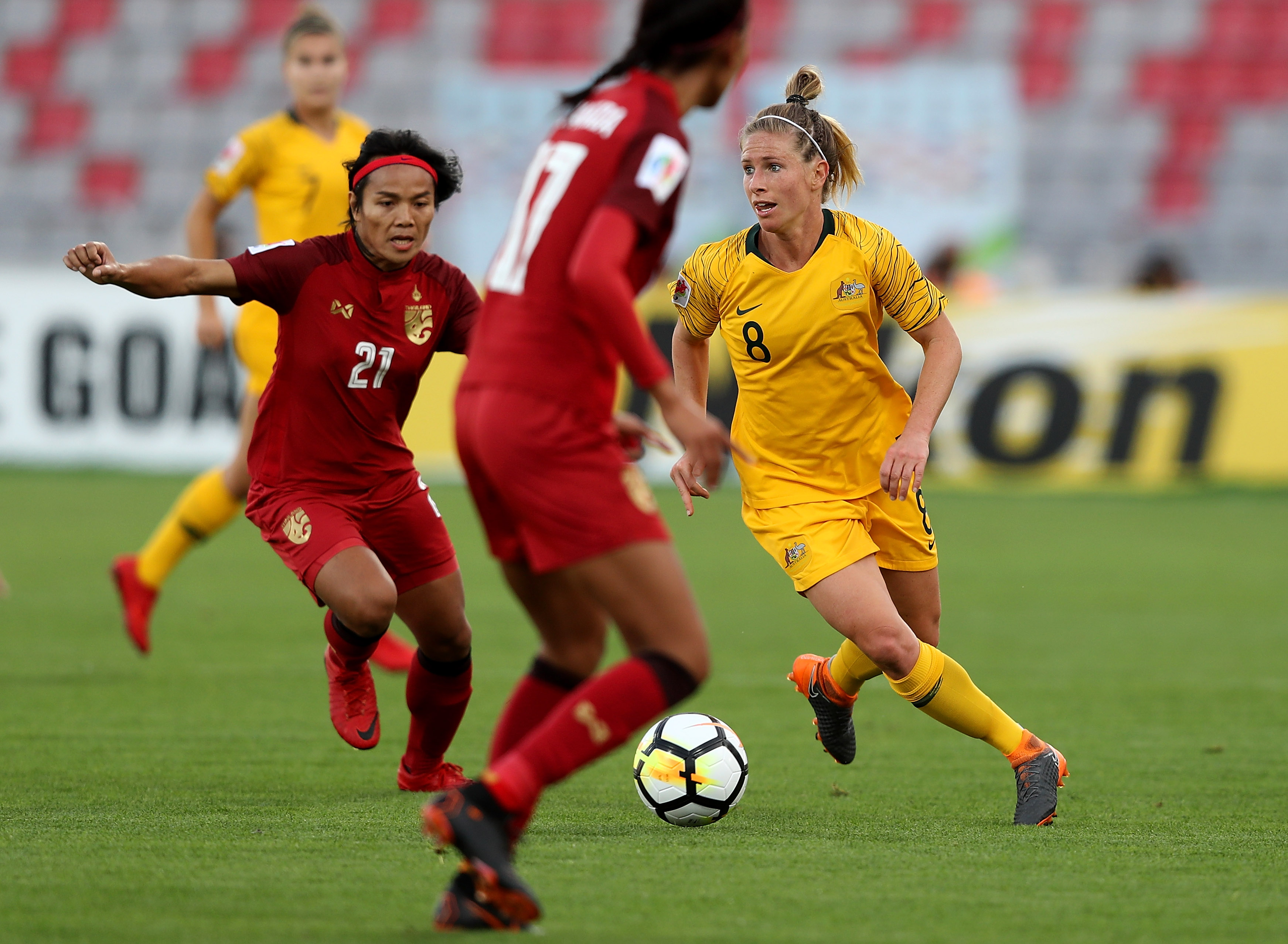 Sung-Ngoen had an almost mirror-image chance towards the end of the first half, zipping into the open green space behind Kennedy and fellow-centre back Laura Brock. Arnold careened off her line and attempted to smother, but the Thai striker wriggled away and charged towards goal. Australia's scrambling defenders ensured their subsequent shots were blocked and the teams went into half-time locked at 1-1.