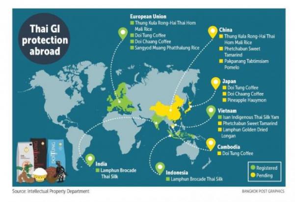 Thailand has GI registration for Thung Kula Rong Hai hom mali rice, Doi Chaang and Doi Tung coffee, and Sangyod Muang Phatthalung Rice in the EU; Lamphun brocade Thai silk in India and Indonesia; and Isan Indigenous Thai Silk Yarn in Vietnam.