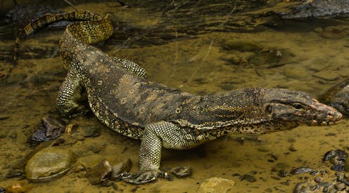 The South-East Asian water monitor (Varanus salvator macromaculatus) originally evolved in the region’s mangroves and has remained largely unchanged for around 17m years. It’s primarily adapted for life in and around water, with nostrils positioned high on the end of an elongated snout for breathing while submerged, and a long tail that works as the perfect aquatic propulsion system. However, when the monitors are threatened the tail turns into a powerful club with a jagged crest that makes it all the more dangerous.