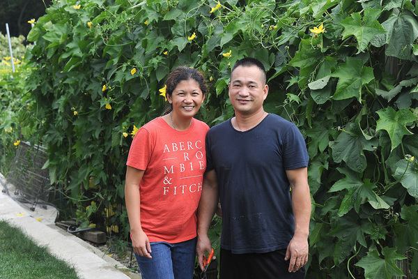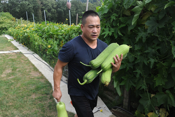 The vines quickly covered the tunnel with huge leaves and yellow flowers. Wei Chen started picking July 25 and was amazed to find fruit three times the size he was used to. The biggest was nearly 4 feet, almost as tall as Caleb.