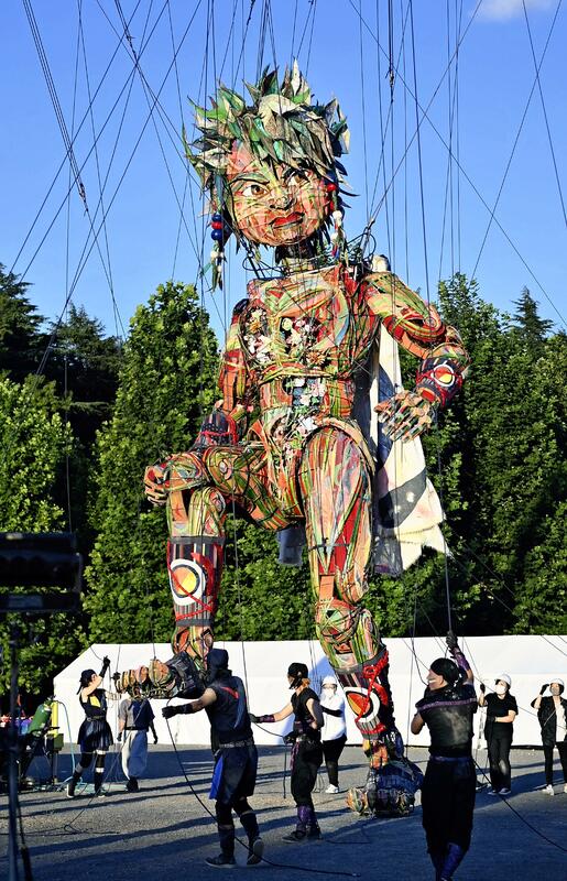A giant puppet named Mocco dances to music as puppeteers control its colorful arms, legs and eyes during an event at the Shinjuku Gyoen National Garden in Tokyo on Saturday ahead of the Tokyo Games. The 10-meter-tall puppet was designed by children in the Tohoku region, as part of a project to convey an upbeat message to the world and symbolize the resilience of people in areas affected by the 2011 earthquake and tsunami.