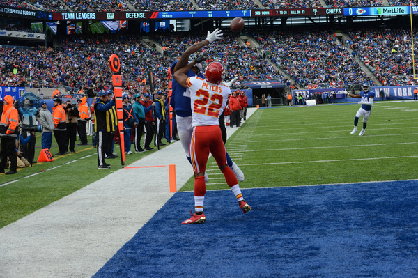 Lewis made a spectacular diving catch as he was being pulled down by a Chiefs corner to haul in the third-and-5 play.