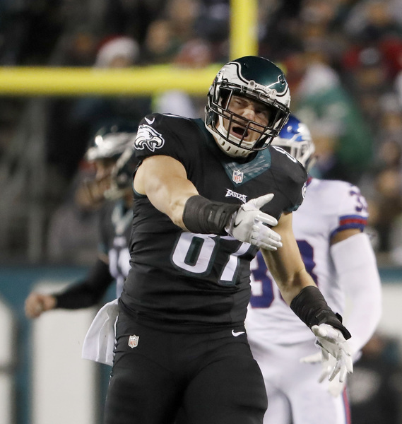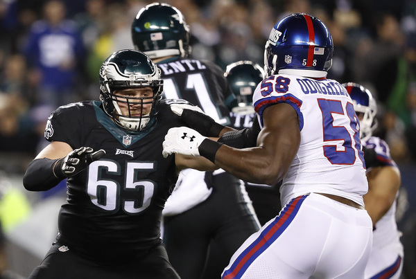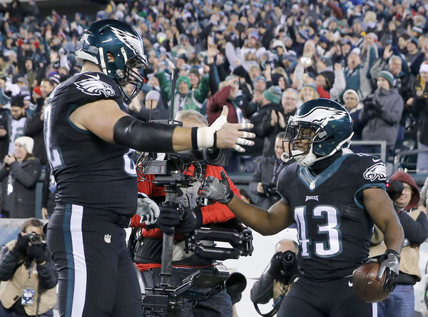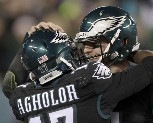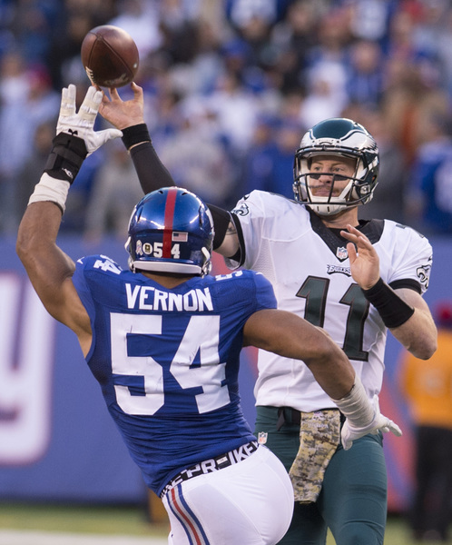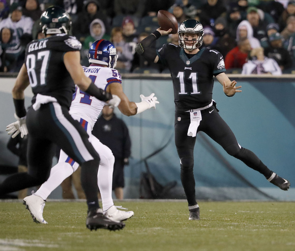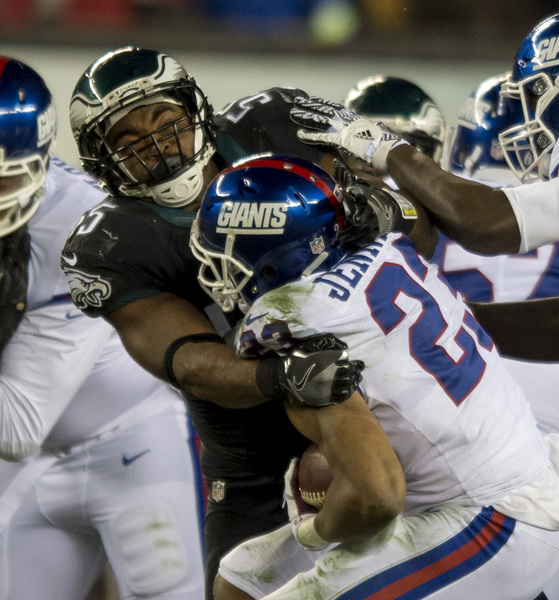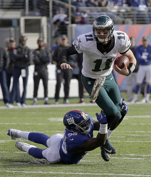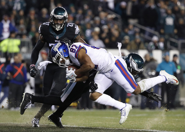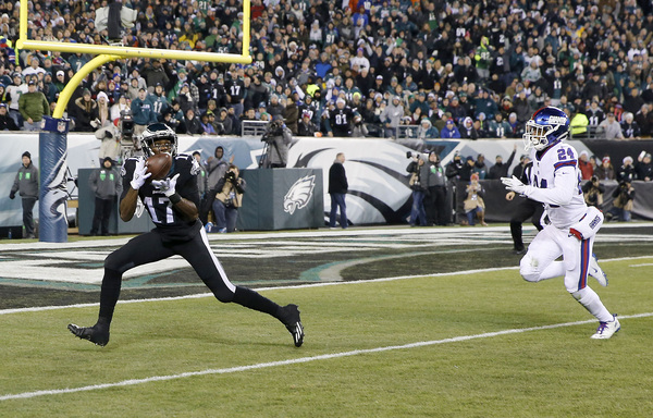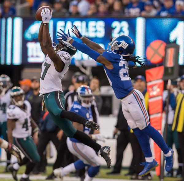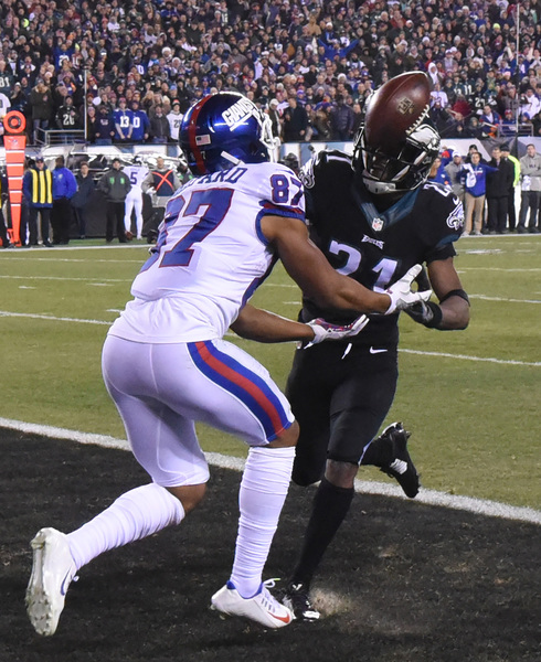 After a goal-line stand late in the third by the Giants _ the Eagles' drive was helped by another questionable call on a hit on Wentz, this time from Olivier Vernon on what would have been a third-down stop _ the Giants had a chance to drive to take the lead. Instead, Manning was picked off by Jenkins for the second time on a deep pass down the right sideline intended for Shepard with 11:57 left in the game. That led to an Eagles' 41-yard field goal that made it 24-16 with 8:47 left.