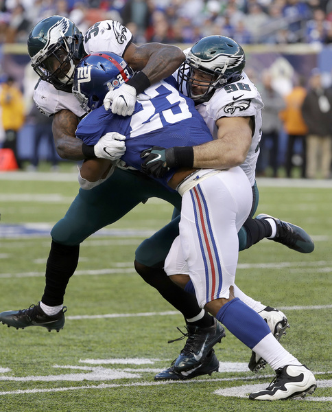 The Giants' throwback uniforms were supposed to evoke the glory days of the late 1980s, but many people forgot that they were also the colors the team wore during the pitiful 1970s and early parts of the '80s. They certainly played more like the earlier vintage in the first half, falling behind 14-0 in the first 6:40 of the game and trailing 21-13 at halftime. The Eagles marched down the field against the vaunted Giants defense for their opening touchdown, scoring on a 25-yard run by Darren Sproles, and then Malcolm Jenkins picked off a Manning pass and returned it 34 yards for another touchdown.