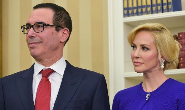 Earlier this year, he and his wife, British actress Louise Linton, sparked controversy when they posed with a sheet of dollar bills at the Bureau of Engraving and Printing. Critics said they looked like villains from a James Bond movie, something Mr Mnuchin, whose signature appears on the bills, seemed quite happy about.