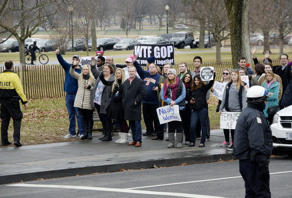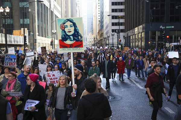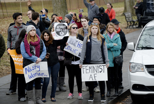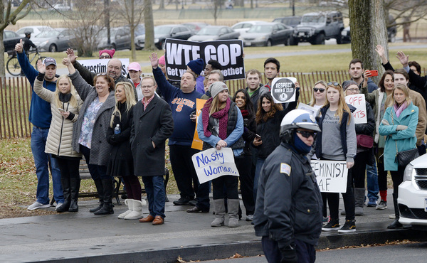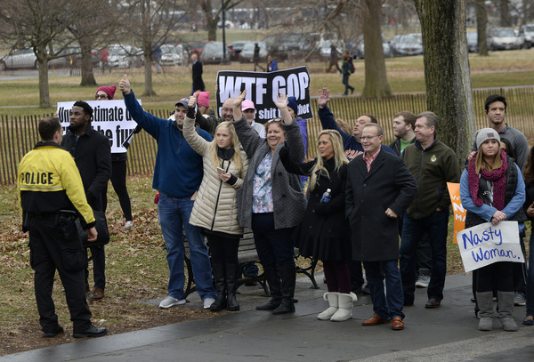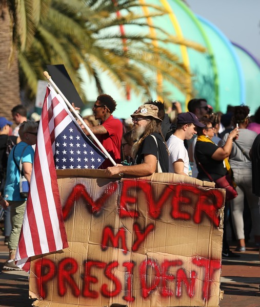 But disdain for Trump's past words and actions during a bitterly divisive campaign were on full display, and often reflected in signs that played off explicit language employed in a video in which Trump talked about sexually assaulting women.