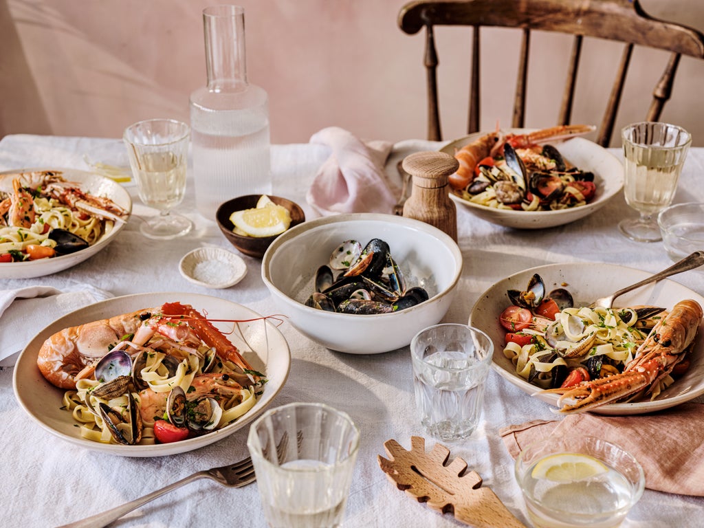 7. Remove the prawns and langoustines and place on a plate (this will make it easier to serve up the pasta, mussels and clams). Equally divide the pasta between four warmed serving plates or bowls, then top each portion with a langoustine and two prawns. Serve with lemon wedges. For me, this is my favourite meal of all time.