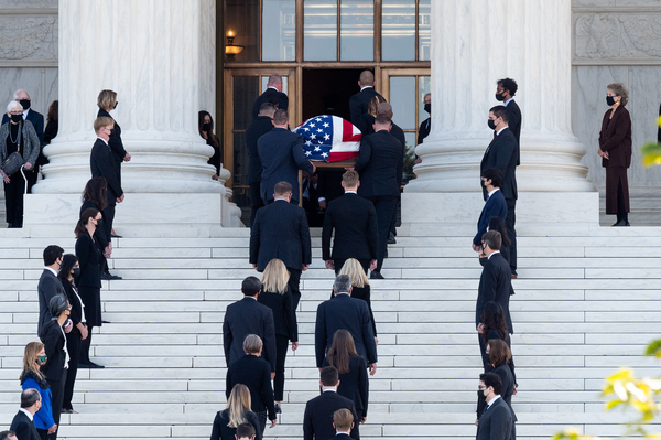 More than 100 of Ginsburg's former law clerks stood silently on the court plaza and steps, wearing black masks and at safe social distances, as her casket was carried by Supreme Court police up the steps and into the Great Hall for a private ceremony.