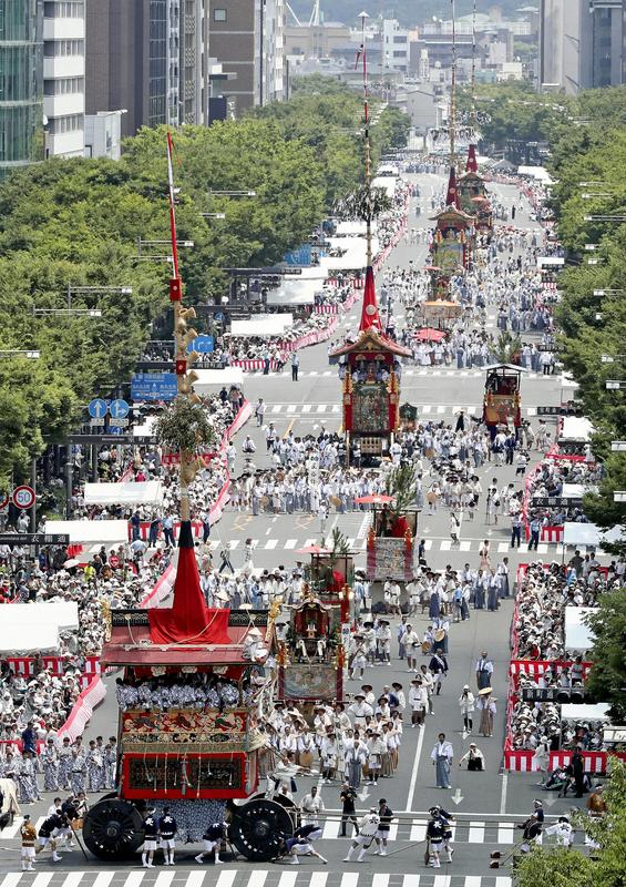 Twenty-three Yamahoko floats, known as "moving museums" because of their elaborate decorations, paraded through central Kyoto on Wednesday as a highlight of the annual Gion Festival, one of the three most famous festivals in the nation.