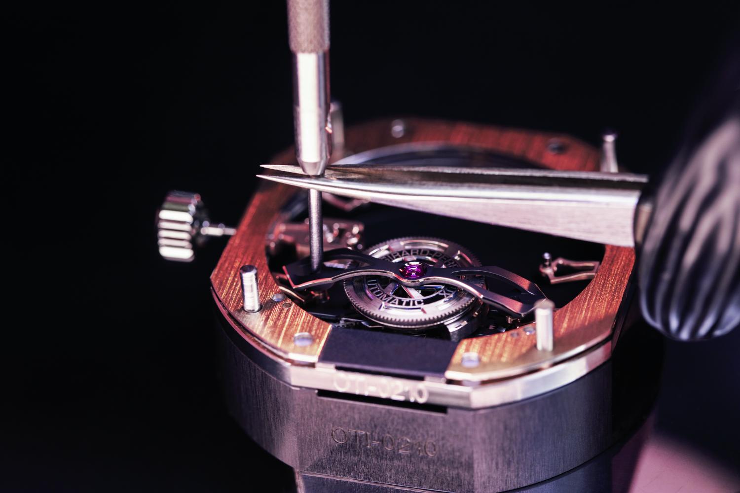 Likewise the three titanium bridges on the back side are covered with black PVD for a contemporary look.