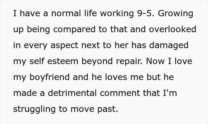 Our protagonist told Bored Panda that many people have suggested that she try therapy to address her insecurities and that she is open to exploring this option to see if it helps, as years of comparing herself to others have caused significant harm to her self-esteem.