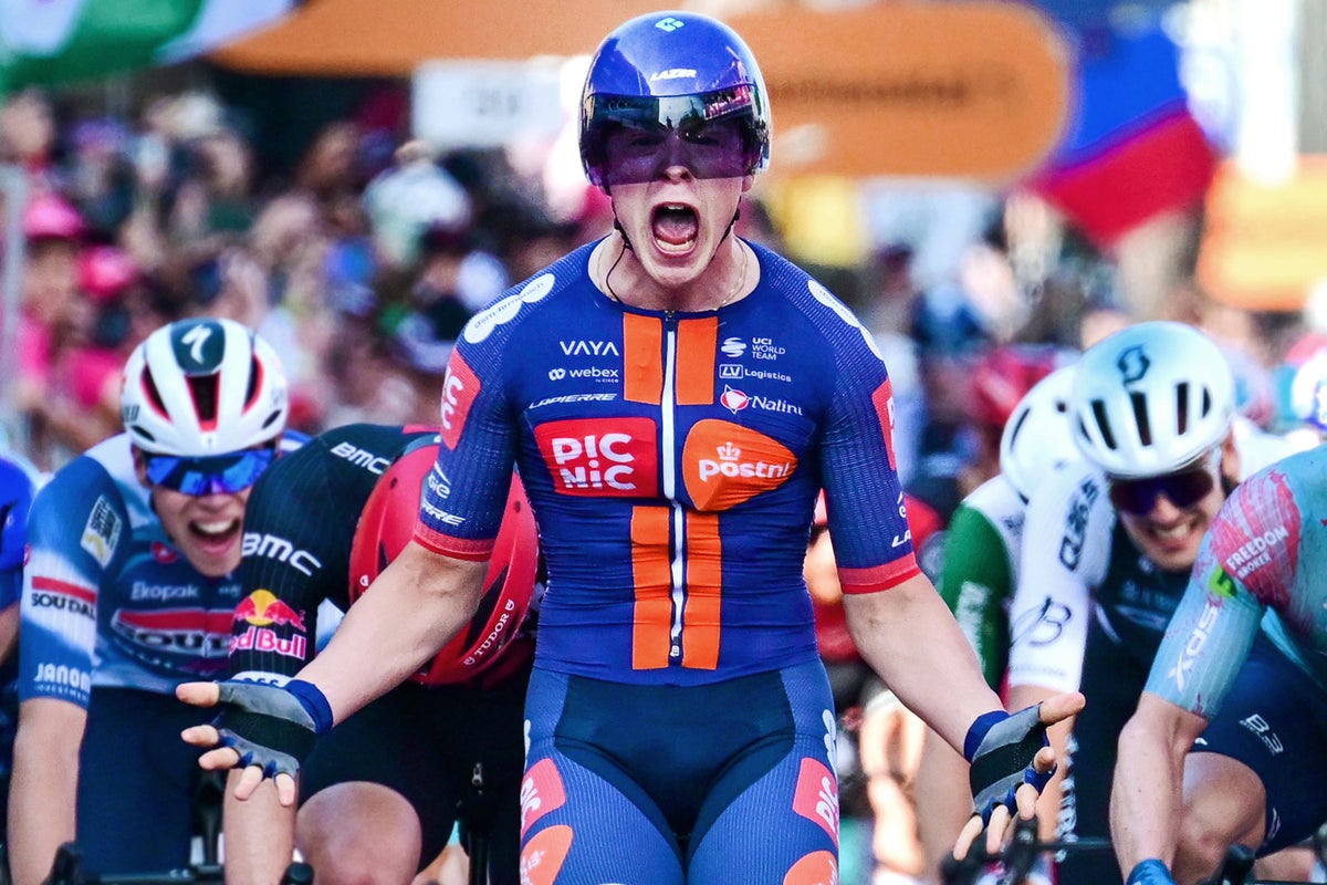 His Picnic PostNL squad came from nowhere inside the final kilometre as the peloton jostled for position, with van Uden launching a long-range sprint from 500m out and holding off the day’s favourite, Olav Kooij, and Maikel Zijlaard for the win.