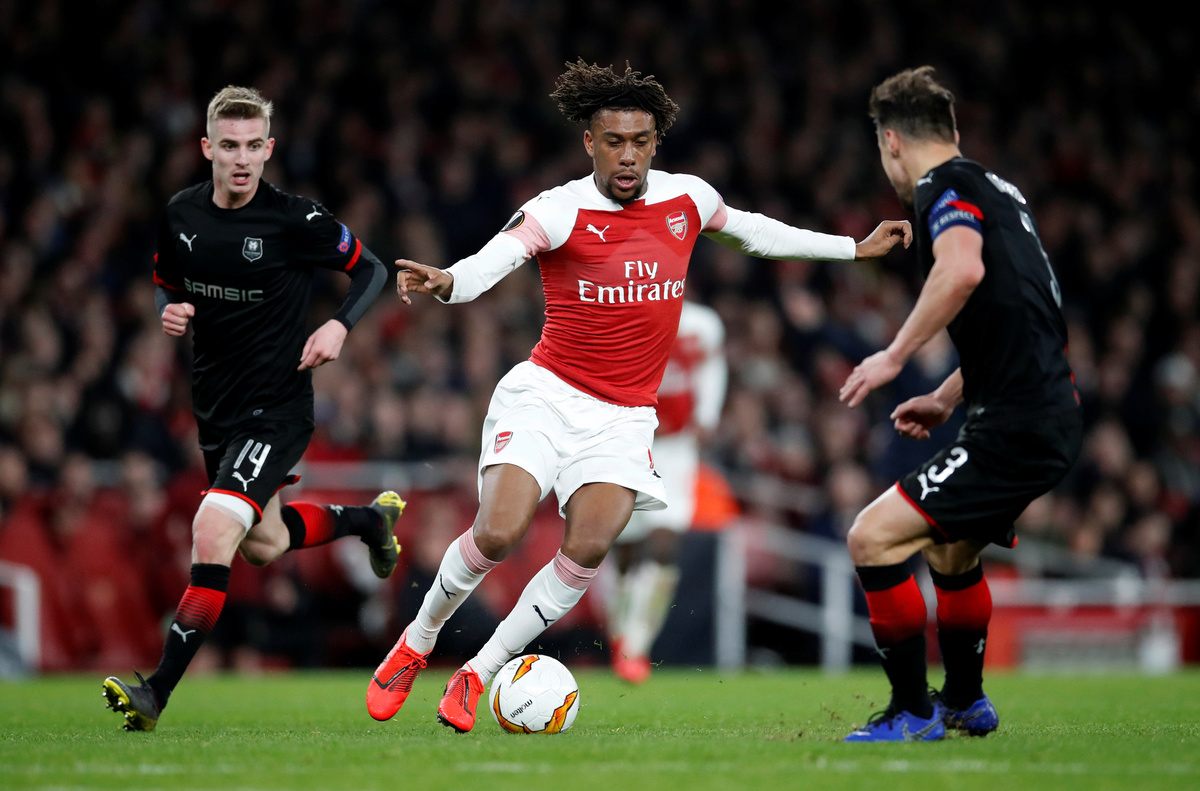 Soccer Football - Europa League - Round of 16 Second Leg - Arsenal v Stade Rennes - Emirates Stadium, London, Britain - March 14, 2019 Arsenal's Alex Iwobi in action with Stade Rennes' Benjamin Bourigeaud REUTERS/David Klein